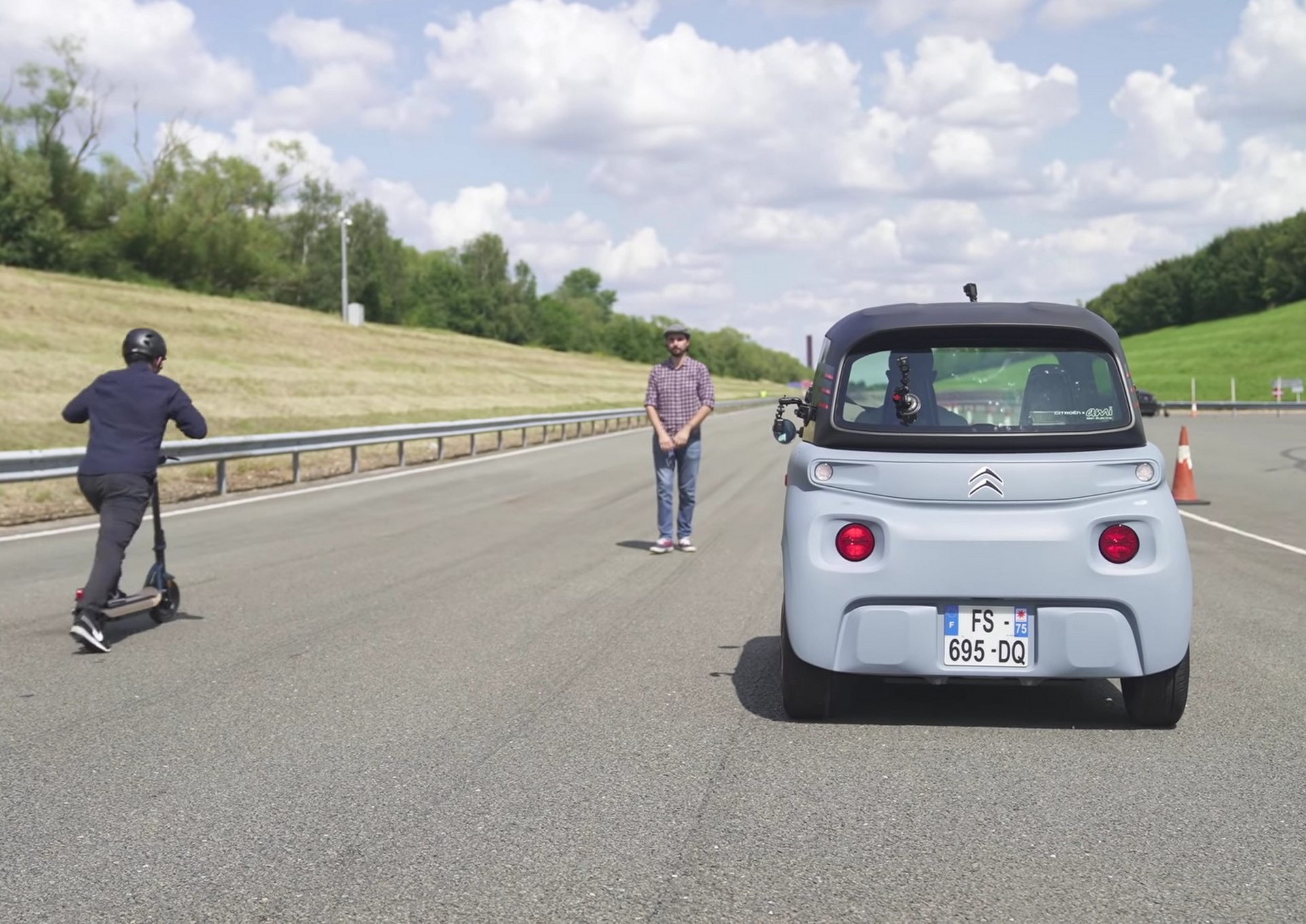 CarWow has thus given us a drag race between the Ami, an electric scooter, and an e-Bike. On paper, the scooter looks pretty good with its 700W (0.9 hp) motor and its 64 km (40 miles) of range. Its top speed of 24 km/h (15 mph) means that the fix was in and it could have never won its heat.