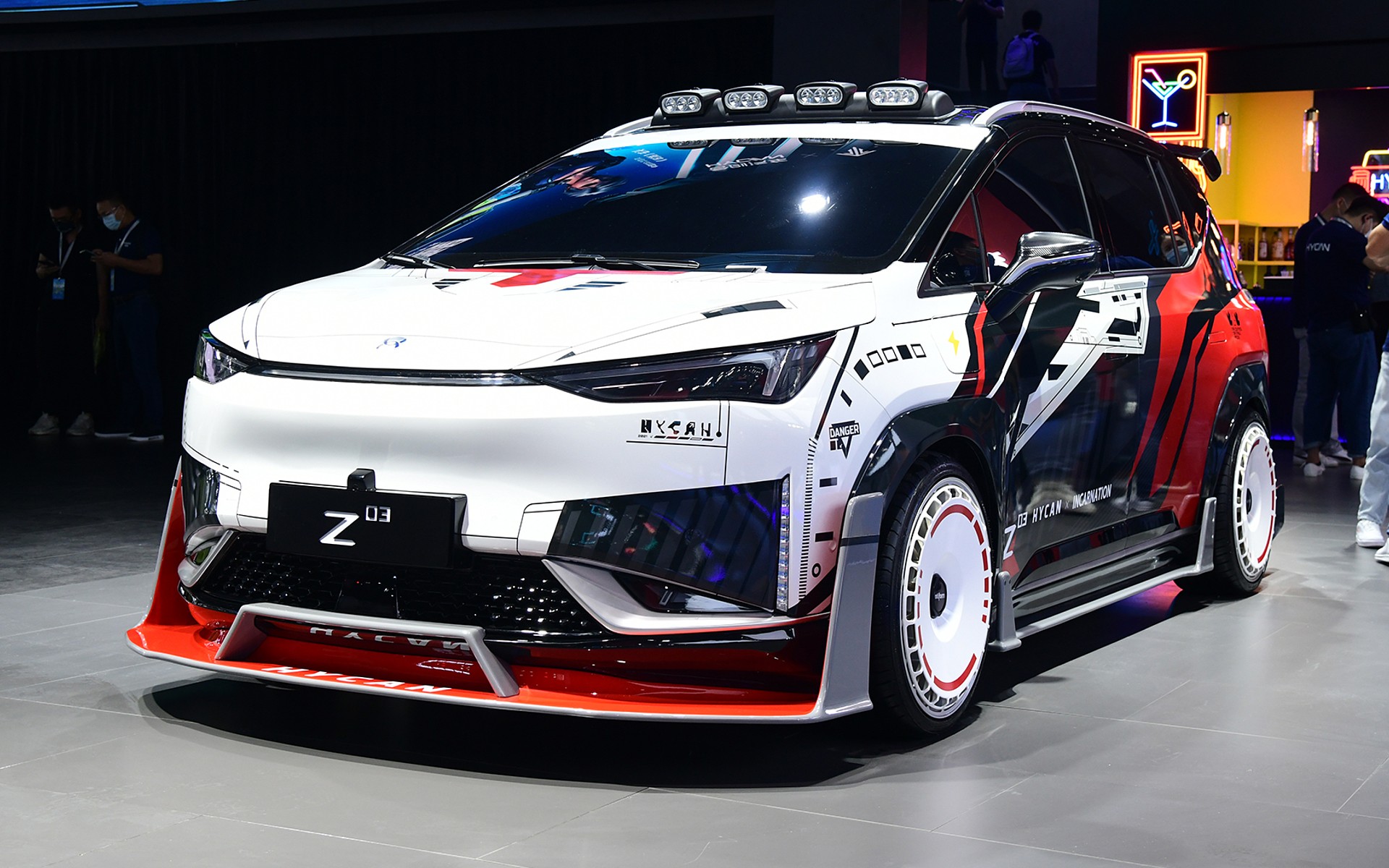 The Hechuang Z03 is a brand-new fully-electric compact SUV for the Chinese market which has up to 215 hp (160 kW / 218 PS) of power and a 76.8kWh battery pack in its flagship variant. The designers at Hechuang thought they should advertise the sportiness of their SUV by creating a one-off concept car. Thus, the pictured vehicle got lowered suspension, a huge front splitter, aero-wheels, rear wing, diffuser and a special white, black, and red livery. The additional LED lights mounted on the roof are bit confusing, but we guess they wanted it to resemble a WRC racecar.