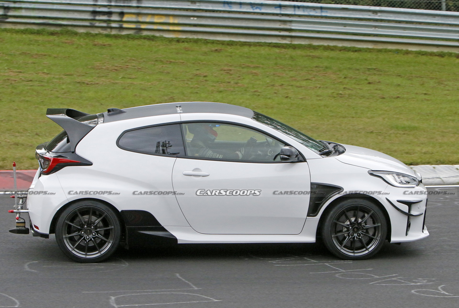 As we can see from the pictures, the track-focused GR Yaris has a set of canards on the front bumper, additional vents behind the front wheels, an extra piece on the rear fenders, and a significantly larger rear wing. All extra aero components in this test car are black, and we suspect they could be made of carbon fiber. This time the car is fitted with production-spec wheels while it keeps the data-gathering sensors mounted at the back.