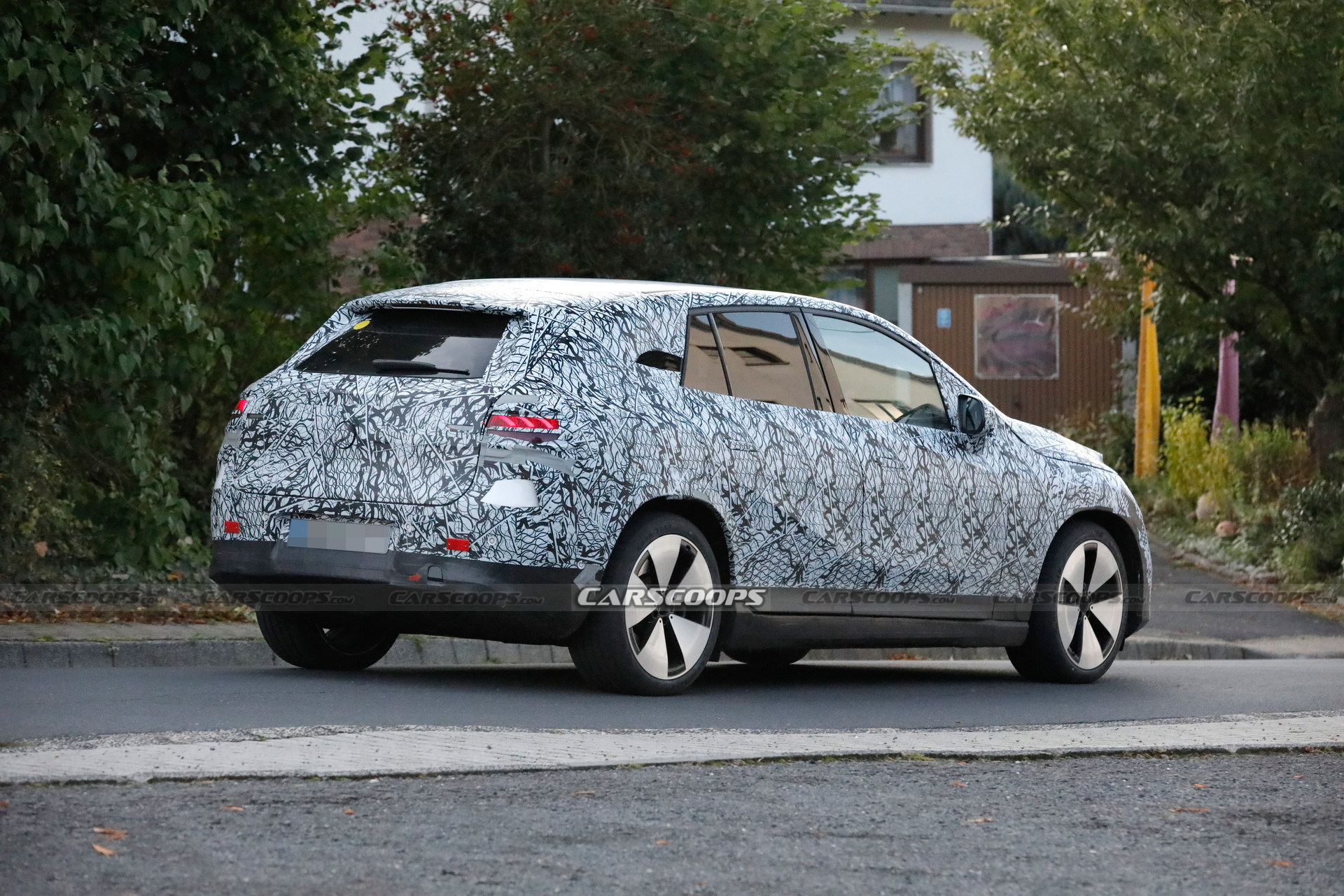 Another cool detail we discovered under the camouflage thanks to the lighting and the angle of the photographs, is the new wave-shaped character lines above the flush door handles. Overall, the electric SUV has an aerodynamic silhouette with rounded surfaces and large-diameter wheels. The front end is dominated by the huge but completely covered grille which – like in every model of the EQ range – is visually connected with the headlights.