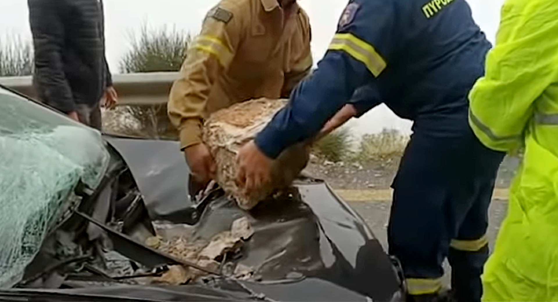 The incident occurred on Sunday morning, October 17, on a road close to Arachova which is about two hours northwest of Athens. The older generation Volkswagen Polo (2005-2009) was moving at normal speeds when it got hit by the falling rock. Two more cars were passing through at the same time with the drivers avoiding the debris.