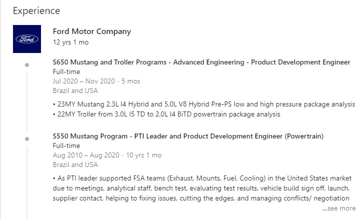 The information should be taken with a grain of salt, but their profile lists them as a product development engineer on the S650 Mustang. More importantly, it says they worked on hybrid versions of a 2.3-liter four-cylinder and 5.0-liter V8 engine.
