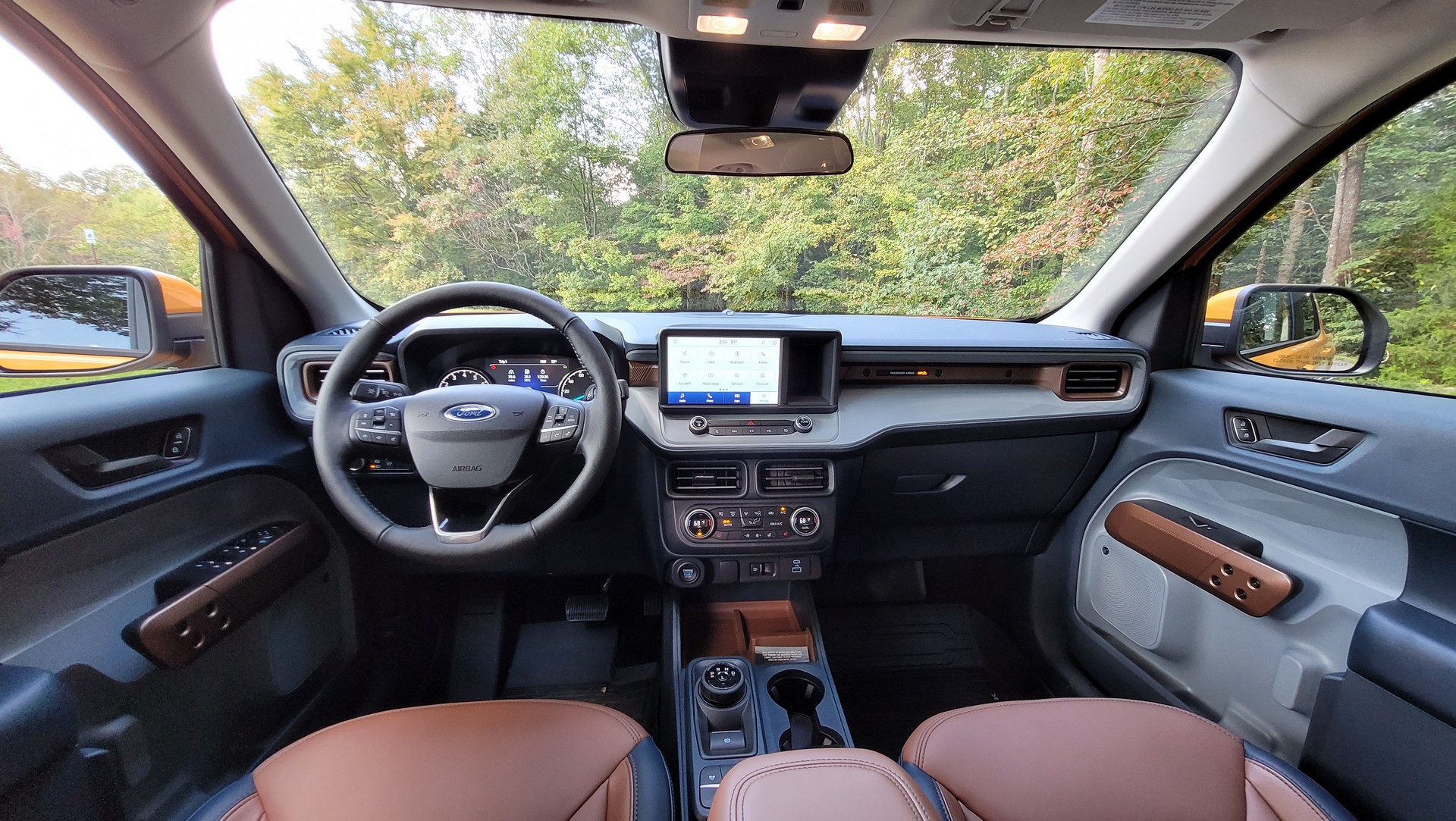 That being said, the Maverick features a colorful and stylish cabin. While it’s far less luxurious, the range-topping Maverick Lariat starts at a reasonable $25,490 and comes equipped with a leather-wrapped steering wheel, an 8-way power driver’s seat and a 6.5-inch multi-information display. Buyers will also find an 8-inch infotainment system, a dual-zone automatic climate control system, ambient lighting and a passive entry system with a push-button ignition. The model can also be equipped with options such as a heated steering wheel, heated front seats, and adaptive cruise control with stop and go.