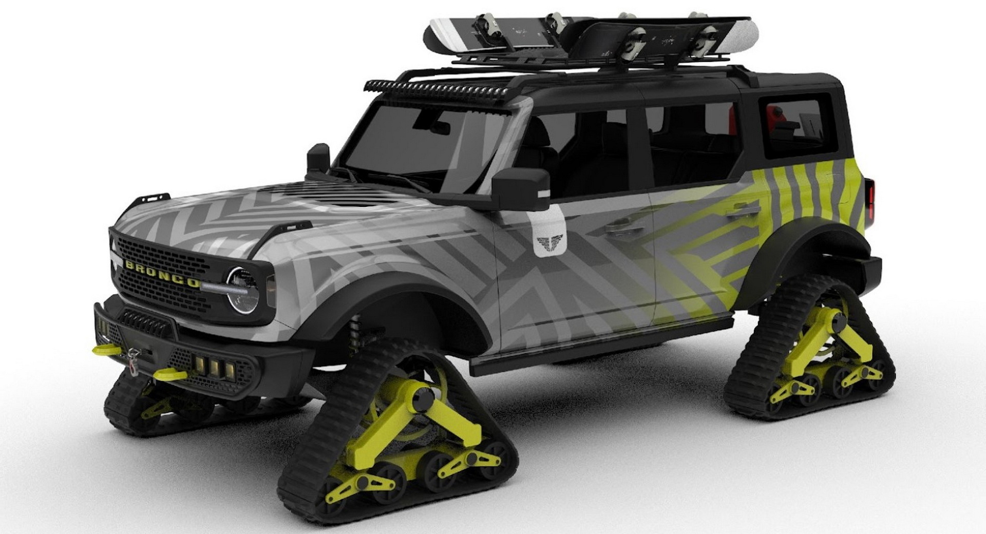 This quad-track snow adventure vehicle is based on the four-door Badlands Bronco and is designed for snow and ice. It features Mattracks 88-Series quad tracks, Ford’s swing gate storage, a flat snowboard rack, and a Yakima LockNLoad platform roof rack.