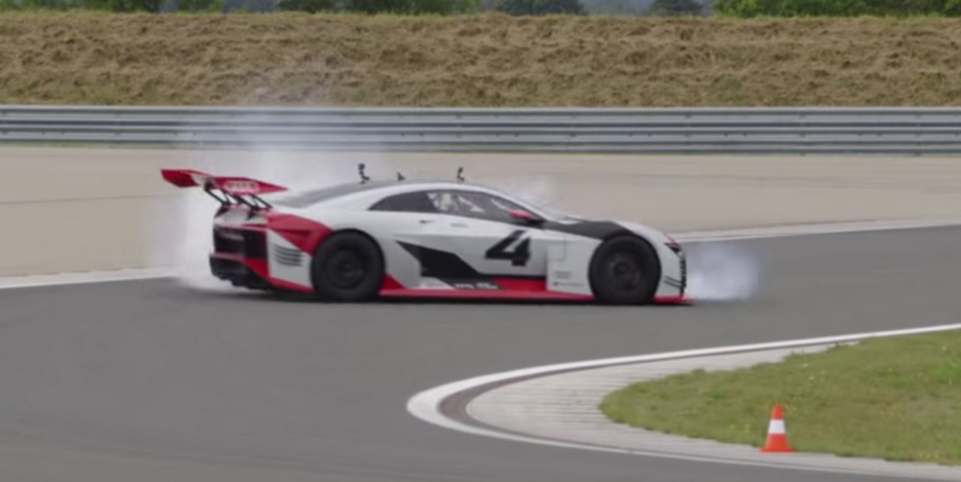 After his drive in the high-revving V8, Block is taken back to Audi’s Neuberg test track to drive something decidedly more recent, the all-electric, 804hp e-tron Vision GT, which he promptly spins.