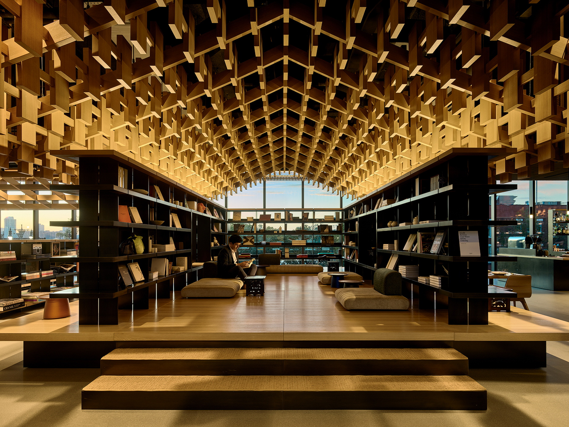 The tea pavilion, meanwhile, is a veranda-like living room space that features customized boryo floor seating. It borrows motifs from the chaekgado painting style to visualize the philosophy of virtuous scholars known as seonbi. A gridded bookshelf showcases collectibles and acts as a wall for the pavilion, while windows frame panoramic views of the Hudson River and the High Line.