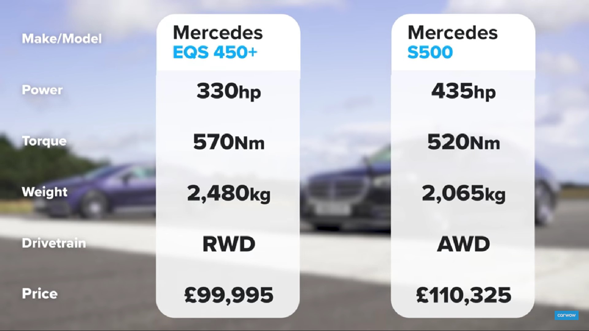 Carwow’s latest straight-line speed test pits an ICE-powered and an all-electric luxury sedan, namely the Mercedes S500 and the EQS 450+, against each other in a series of drag races.