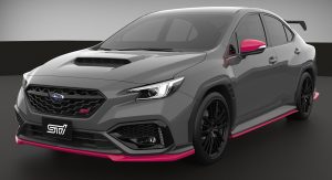 Compared to the WRX S4 STI Sport R that is already on sale in Japan and served as a base for the concept, the new aero includes a splitter, side sills and rear bumper extensions painted in pink, matching mirror caps and STI emblem, plus a large carbon-fiber rear spoiler. The bumpers seem to be slightly redesigned for a sportier look while there is a new set of black rims shod in performance tires. We are not sure if there will be any mechanical upgrades over the production model but Subaru also mentioned a performance muffler.