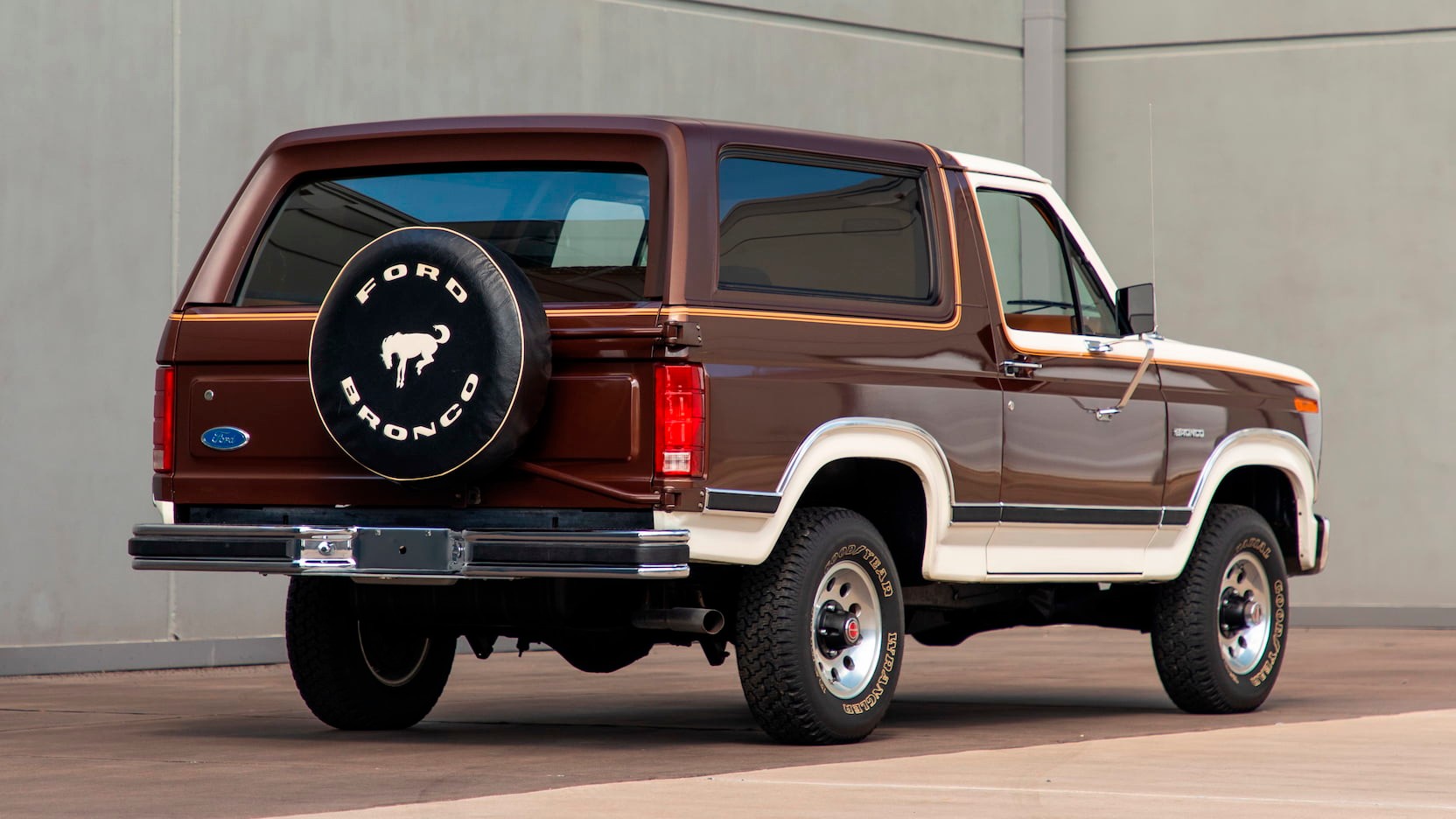There’s no word on why the SUV was rarely driven, but it features a Victoria Tu-Tone Dark Brown Metallic and Wimbledon White exterior that appears to be in excellent condition. It also sports shiny chrome bumpers, tinted rear windows, and aluminum wheels wrapped in Goodyear Wrangler Radial tires. They’re joined by subtle pinstripes and a swing-out spare tire carrier with a Bronco-branded cover.