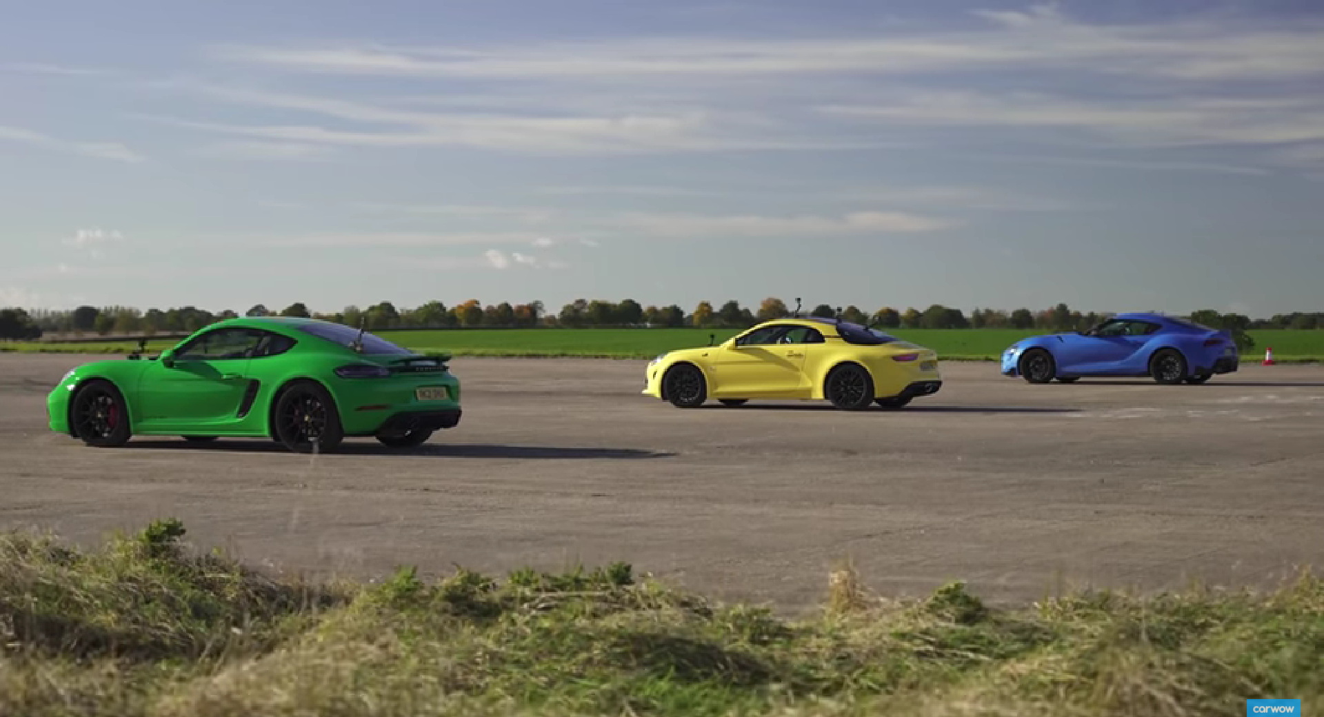 The cars in question are the Porsche 718 Cayman GTS, the Alpine A110 S, and the Toyota GR Supra.