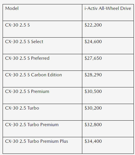 Set to arrive at U.S. dealerships early next month, the CX-30 now comes standard with all-wheel drive. As a result, prices have climbed across the board.