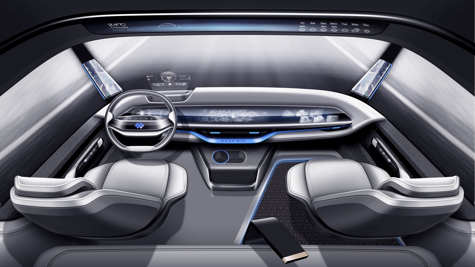 Pininfarina has also designed an interior and it’s unlike any other truck. For starters, the Xingtu has a two-spoke steering wheel sitting directly in front of a large screen stretching the width of the dashboard. The truck also features small screens in the door handles, screens on the A-pillars, and a screen above the windshield. A second-row bench seat is also featured.