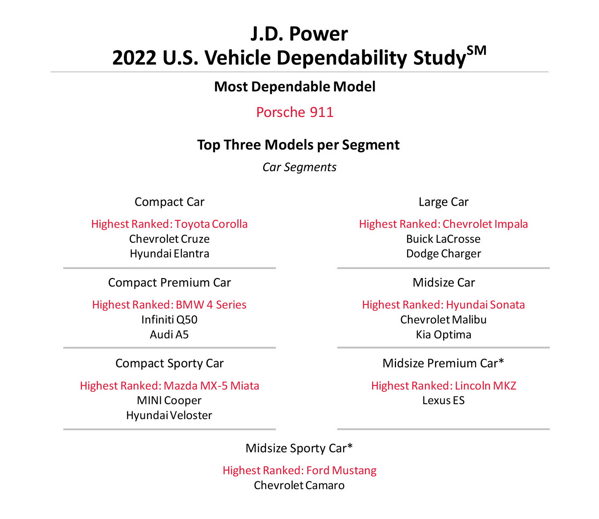 Putting that aside, the Porsche 911 was named the “most dependable model” for the second consecutive year. Other top picks were the Buick Encore, Buick Envision, Chevrolet Impala, Chevrolet Silverado HD, and Chevrolet Suburban. Toyota and Lexus also had a strong showing thanks to segment wins for the NX, RX, and UX as well as the Corolla and Tundra.