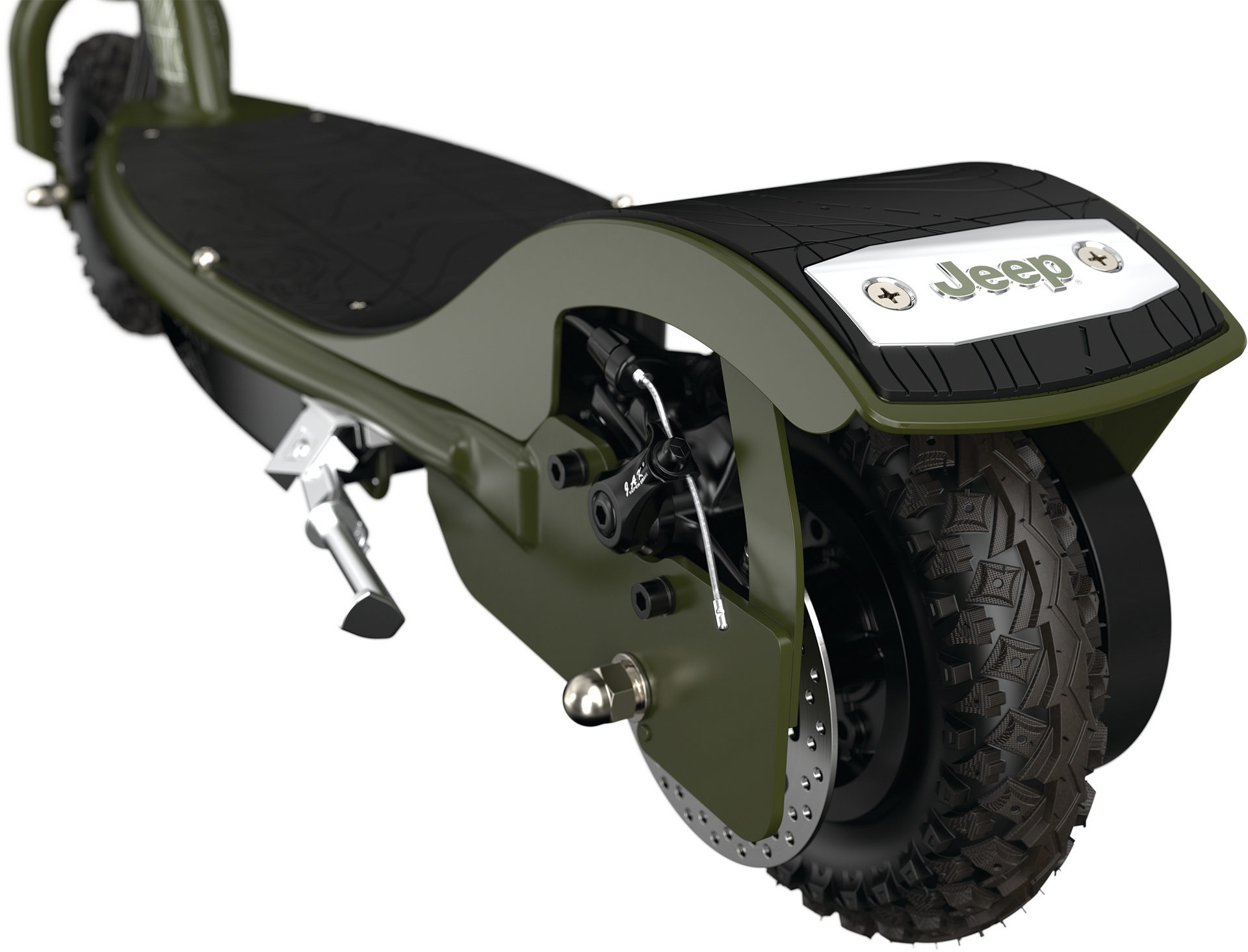 The Jeep RX200 features a wide, comfortable standing platform and riser-style handlebars. A mark on the side also proudly denotes that, like other Jeep branded vehicles, it has been “Trail Rated.”