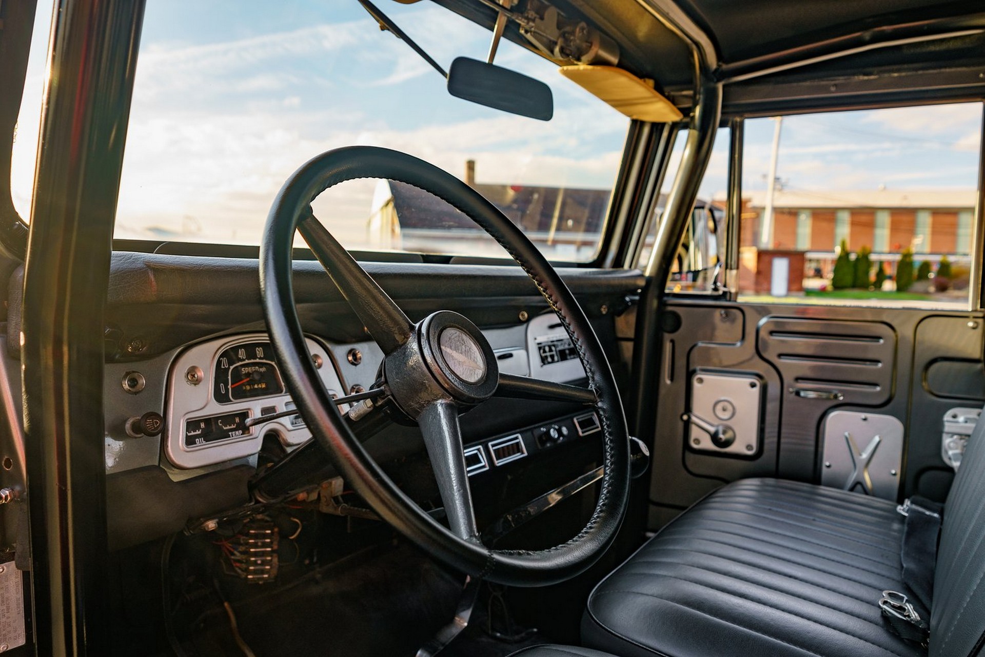 A look inside the cabin shows that it too has been altered. Among the most significant changes made include the installation of a black-painted steel roll cage, new leather-wrapped seats for the driver and passenger, two sideways-mounted bench seats in the rear, and a leather-trimmed steering wheel. Legacy Overland has also installed an aftermarket sound system and a modern air conditioning system as well as an 8-ball shift knob.