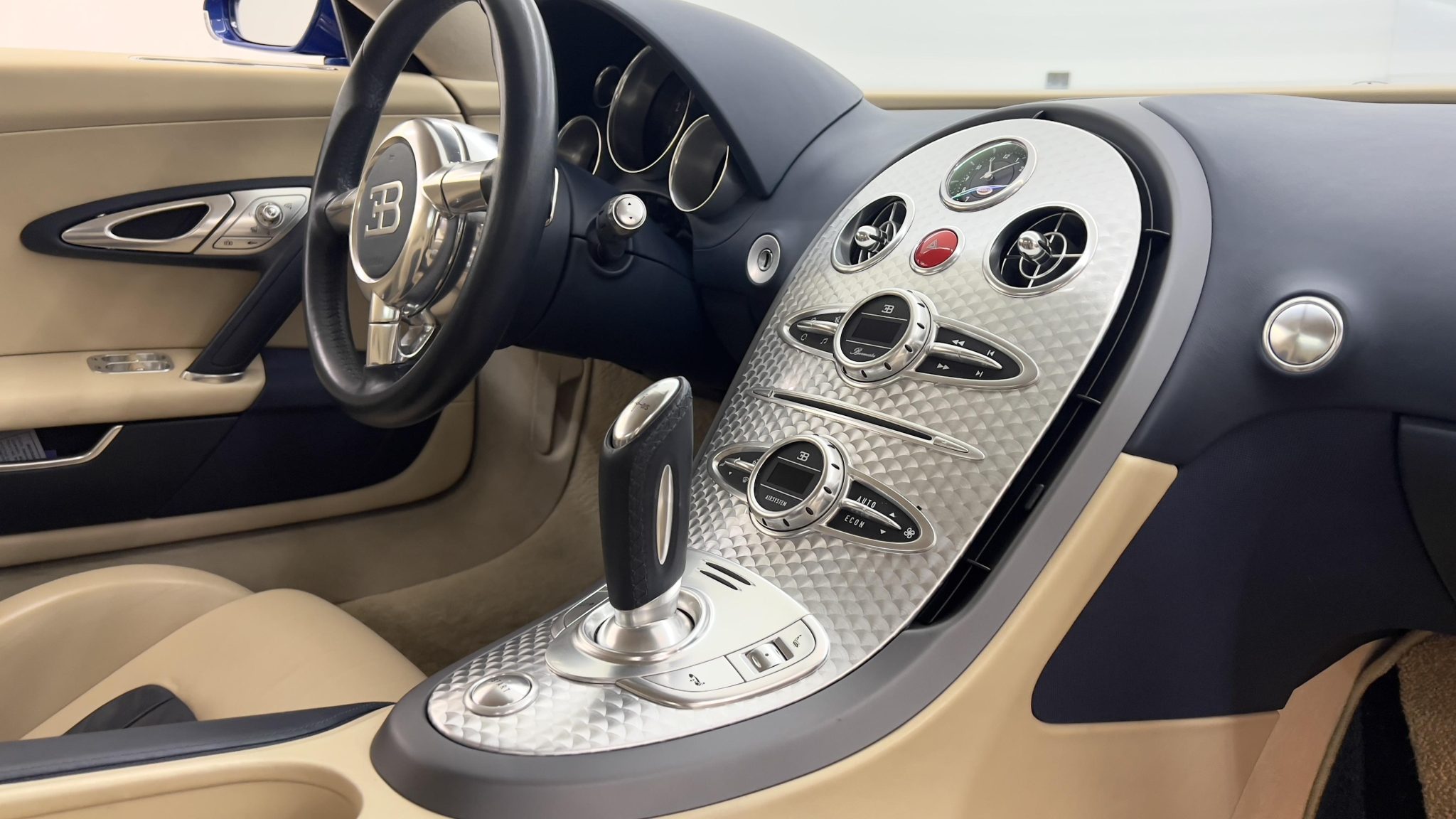 Found in the cabin of Khoshbin’s Veyron are leather-wrapped seats trimmed in tan with blue accents. This upholstery is also found across the door panels, center console, dashboard, A-pillars, and headliner.