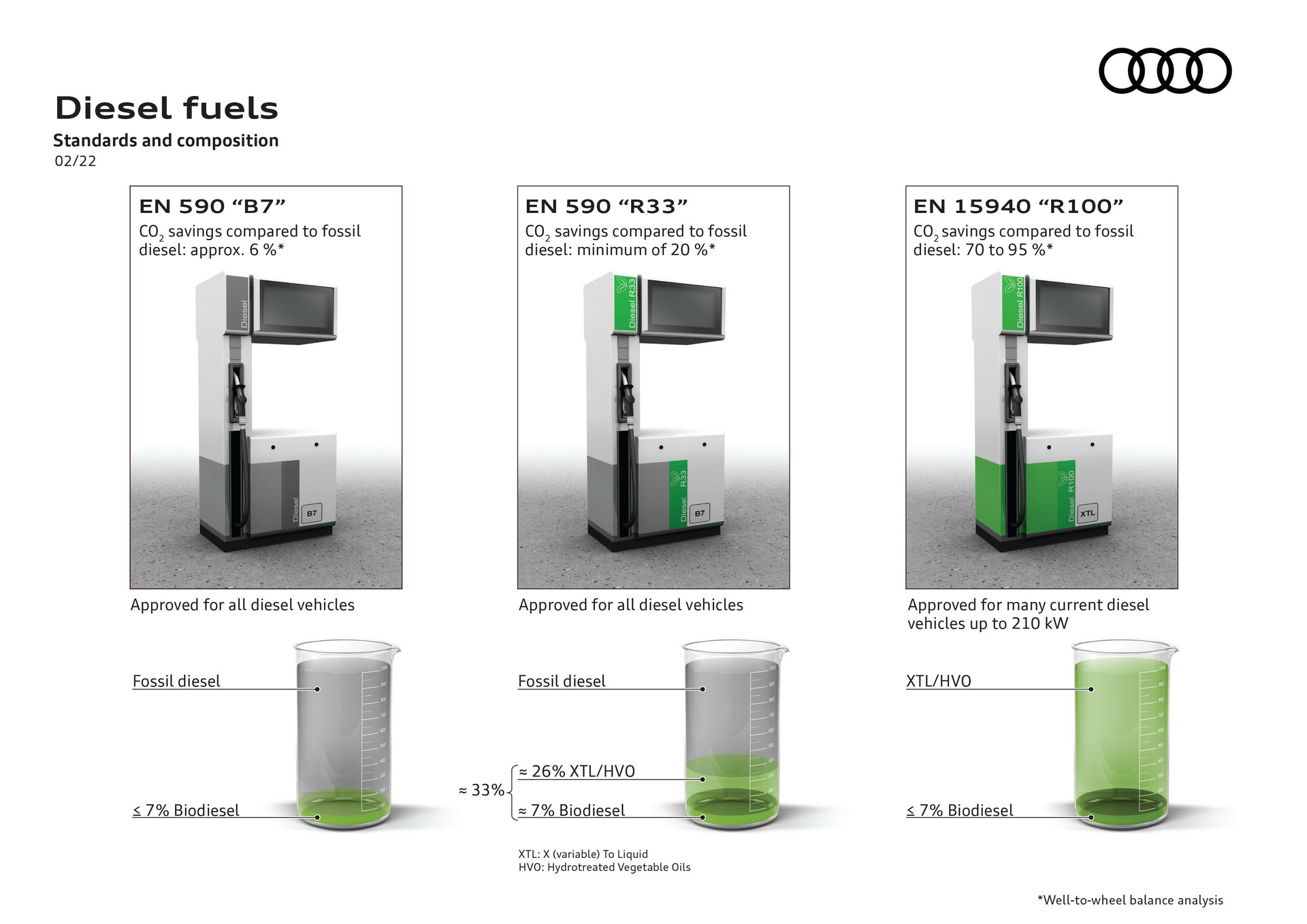 Audi says that HVO enables CO2 reductions of between 70 and 95 percent compared to normal diesel. The fuel can be made from residual and waste materials, such as waste cooking oil from the food industry or residues from agriculture. These oils are converted into aliphatic hydrocarbons, which modifies the properties of the oils to make them useable in diesel engines and gives them a higher cetane rating than traditional fuel.