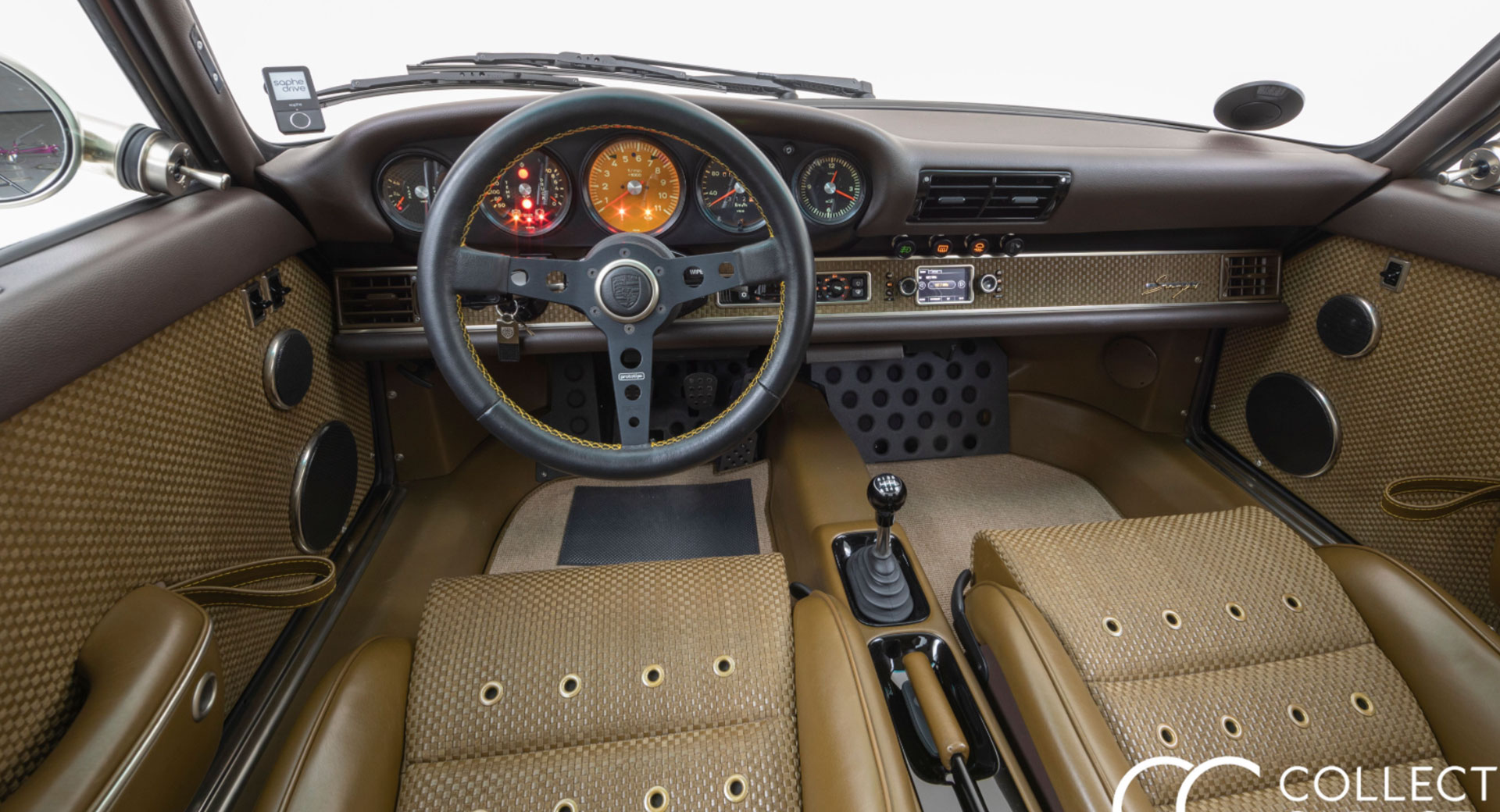 A look inside the cabin reveals suede-mixed weaved Tobacco Olive trim across the seats contrasted by various Dark Tobacco surfaces. There is also Bahama Yellow stitching, brass grommets, a Momo Prototipo steering wheel, ivory headliner, and Bahama Yellow tachometer. The listing reveals the car has been driven just 1,800 km (1,118 miles) since rolling out of Singer’s California shop.