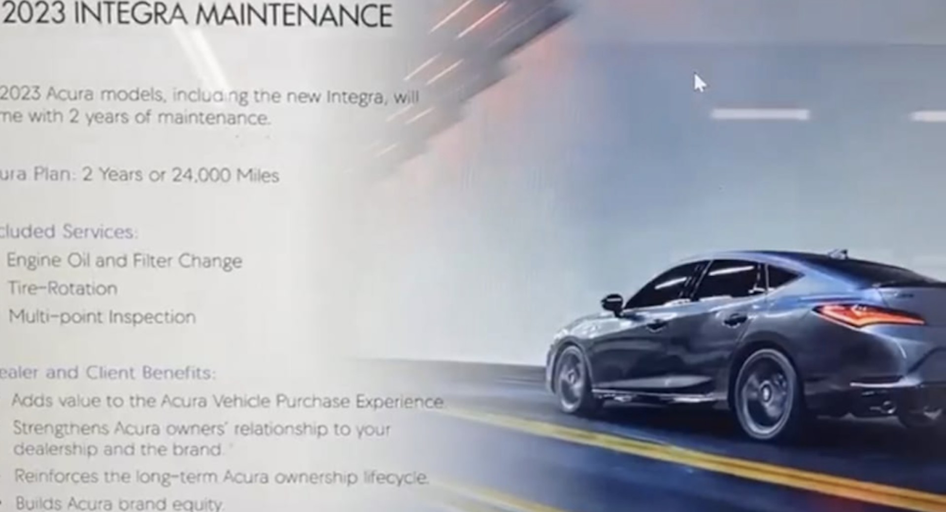 Posted over on IntegraTalk.com, the screenshot purports to show a slide that was shown at a dealer presentation. On it, we see a bunch of details that will be part of the reported rollout. The new ‘Acura Plan’ will apply to all 2023 models including the new Integra.