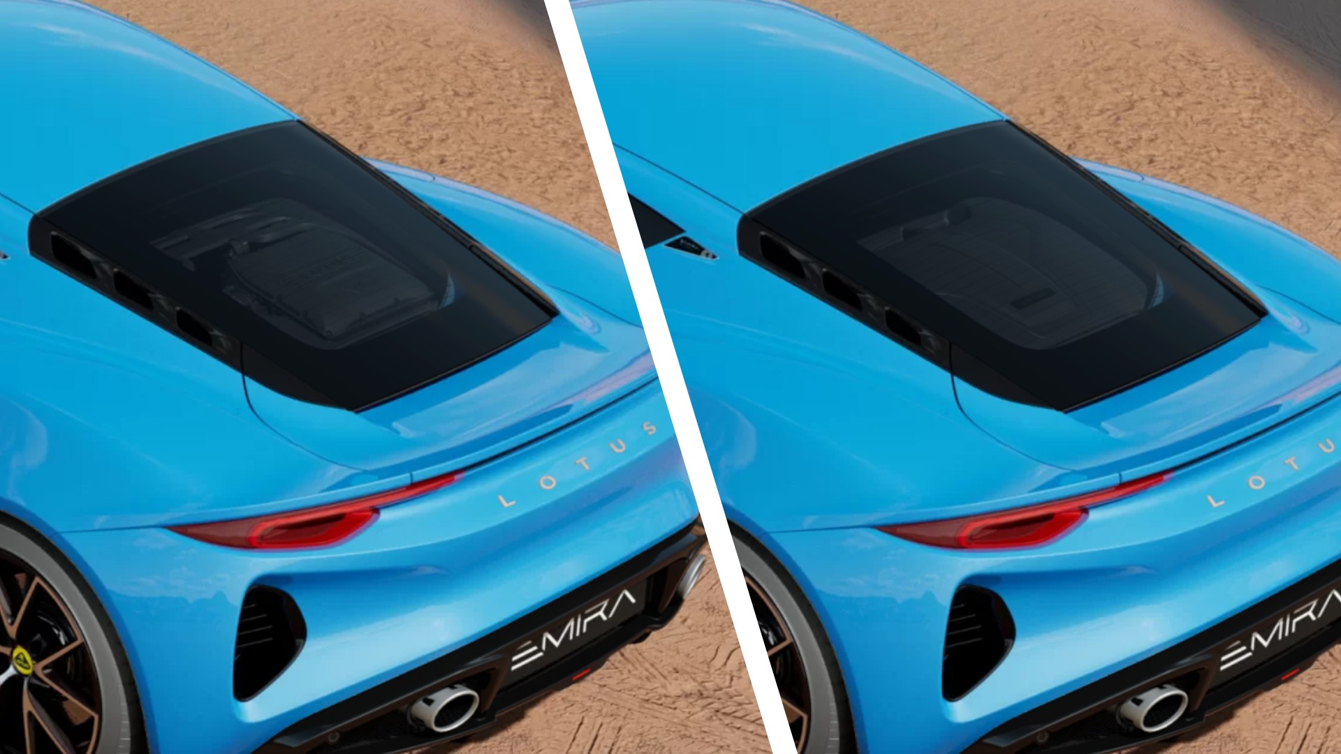 Styling differences between the four-cylinder and the six-cylinder Emiras are limited to the engine bay cover making them unidentifiable from a distance.