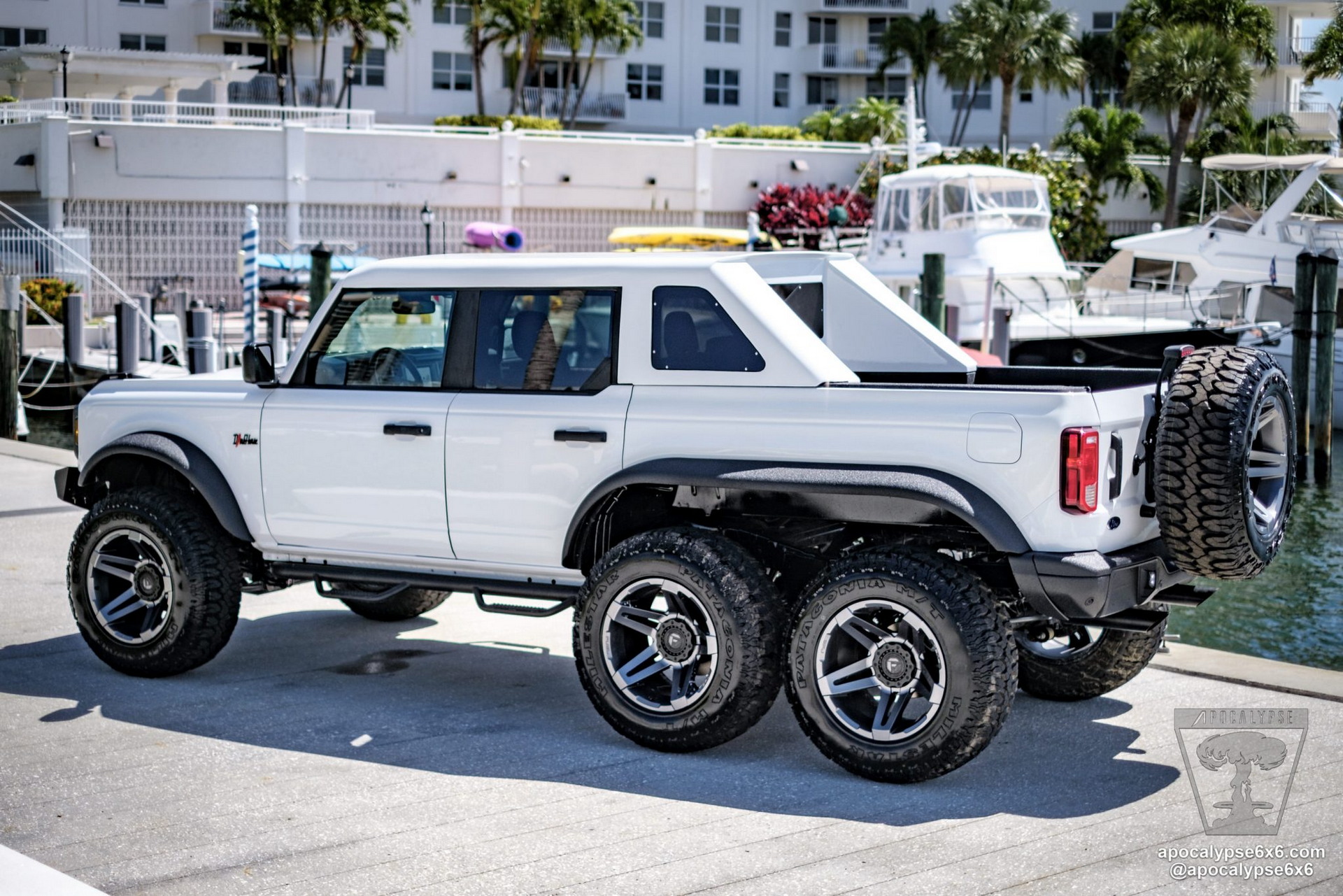 After our piece this morning on the Bronco 6×6, Apocalypse Manufacturing shot us a lot more information on this new creation. For one thing, we now know that Apocalypse adds a full three feet (.91 meters) to every Bronco that they turn into a 6×6 ‘Dark Horse’. That extra length provides space for a fully functional bed and the extra axle beneath it.