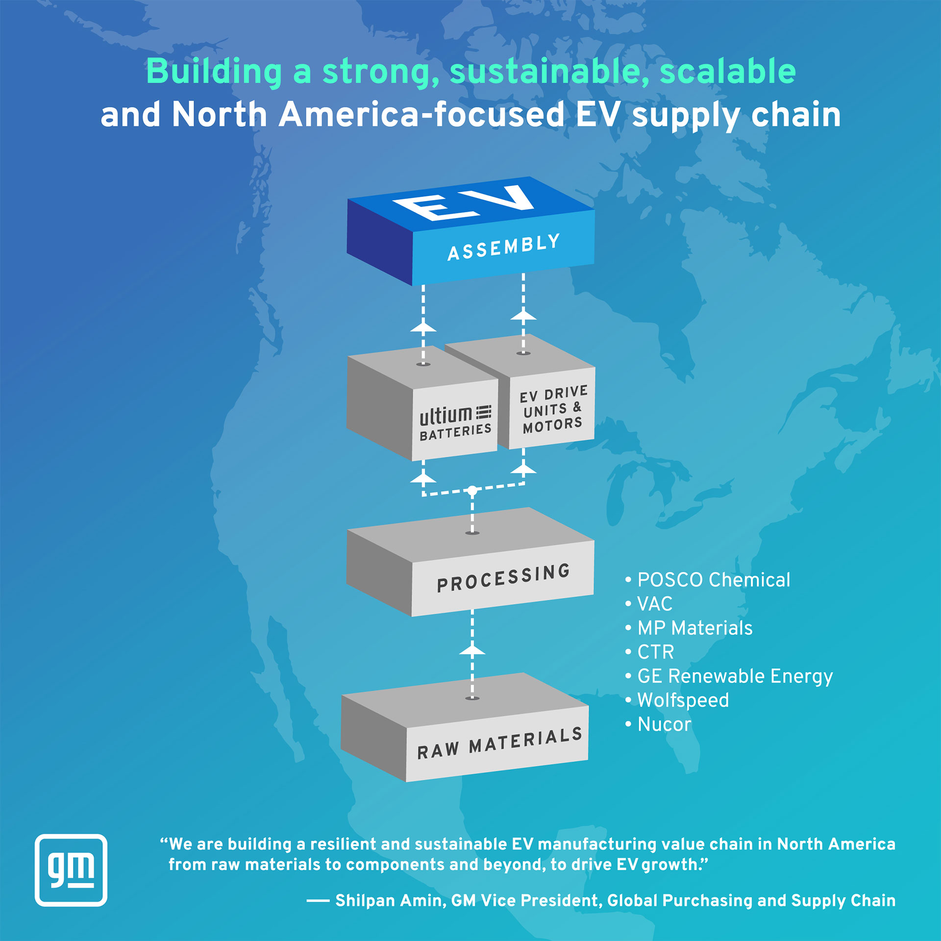 GM is working with other companies to secure a supply chain for EV components. For example, it is collaborating with Controlled Thermal Resources to secure lithium produced in California, will develop a rare earth value chain with GE, source alloy flakes from MP Materials, and purchase permanent magnets from VAC.