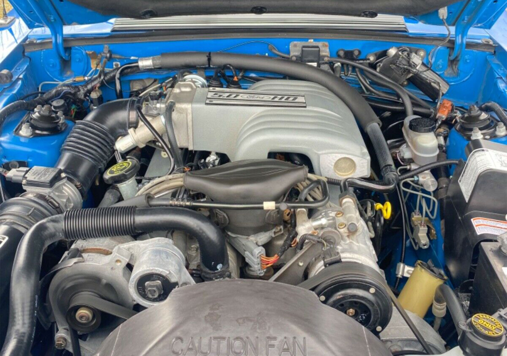 A look inside the cabin reveals cloth-trimmed seat centers with leather sides and backs. The door panels and lower half of the dashboard are also finished in a light tan shade and contrasted by various black components, such as the steering wheel and instrument cluster. Photos of the engine bay confirm that this is a GT variant with a 4.9-liter naturally aspirated V8 as opposed to the 2.3-liter four-cylinder that was also available at the time.