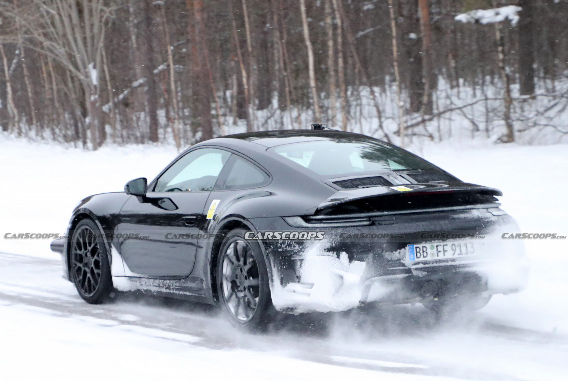 Since the hybrid is based on the facelifted 911, it has a lightly revised exterior with a new front bumper that features vertical fins. We can also see evolutionary headlights, a sport exhaust system, and what appears to be a modified rear bumper.