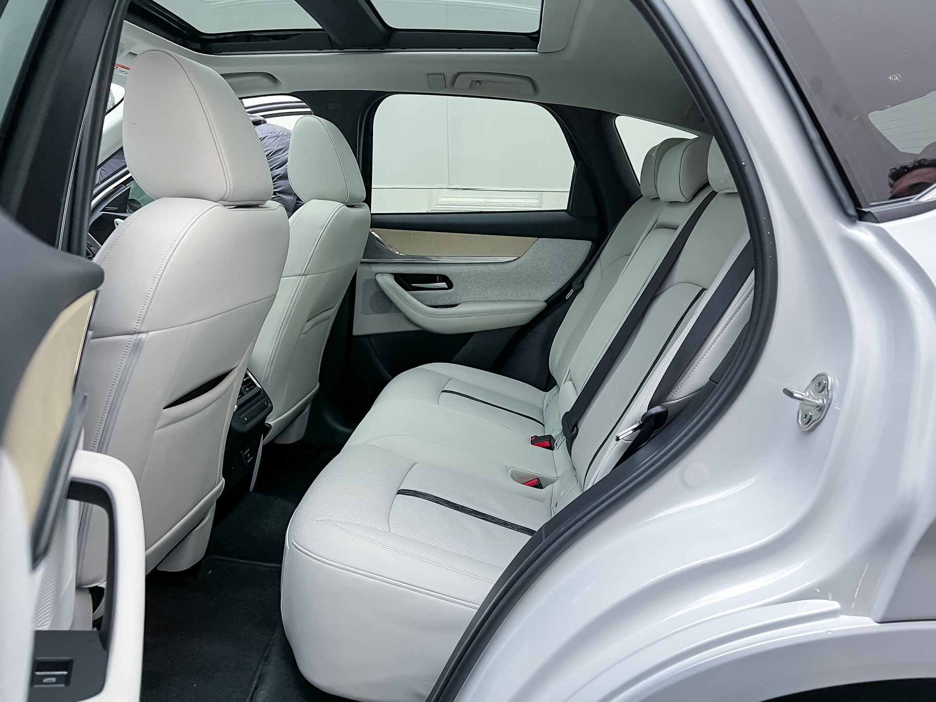The unit we’re getting a closer look at here seems to be the Takumi trim which sits at the top of the range. It features white Nappa leather, 20-inch wheels, as well as natural wood trim. All of those features are on display here. We also get the chance to see the spacious back seats and cargo area with a total area of 570 liters (20.1 cubic feet) too.