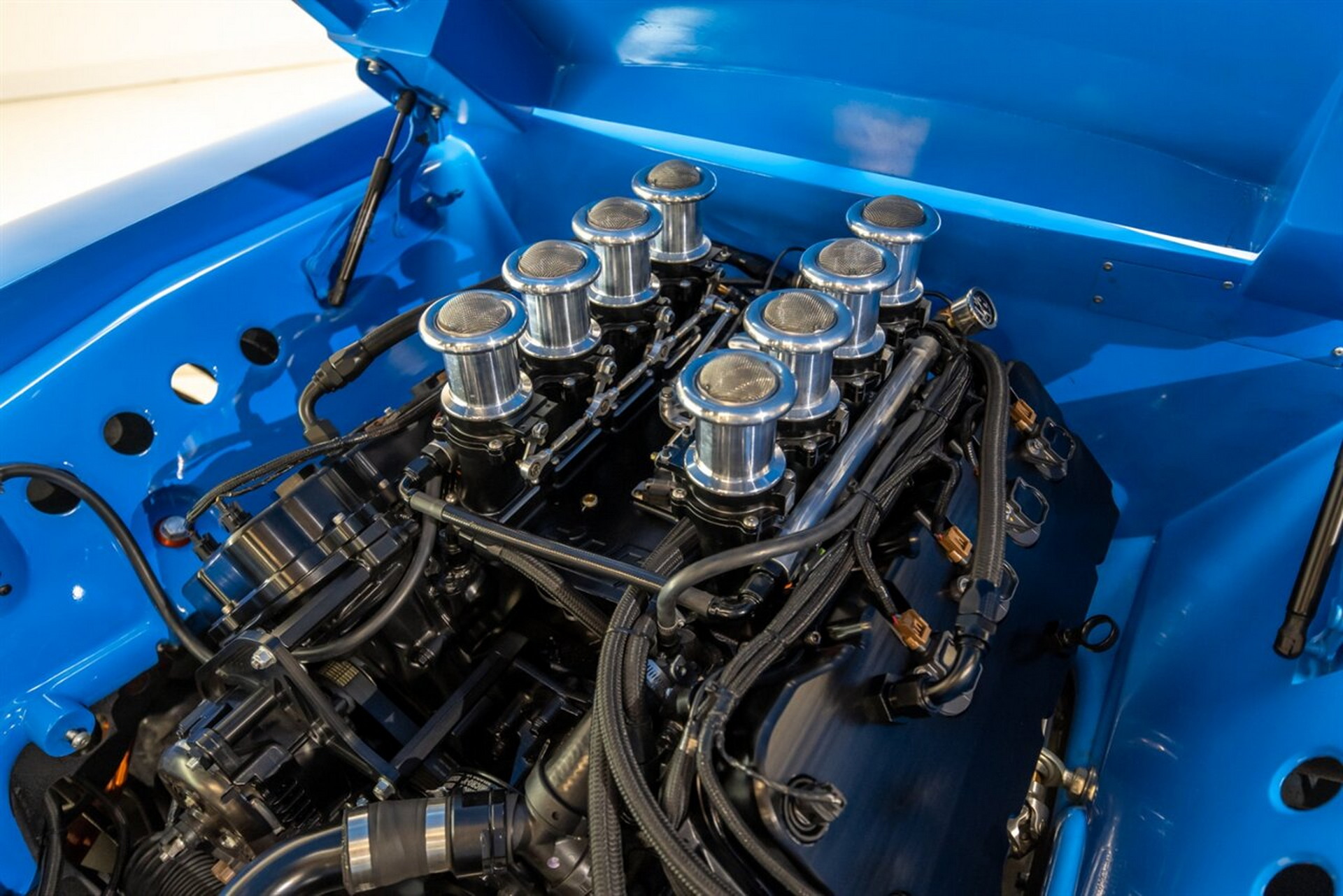 According to the ad, the car weighs less than 3,000 pounds and has a 12-inch extended wheelbase in part thanks to a totally bespoke frame. On top of that frame, the blue paint and black trim look stunning. Small little nips and tucks make this Mustang look far more modern than it truly is.