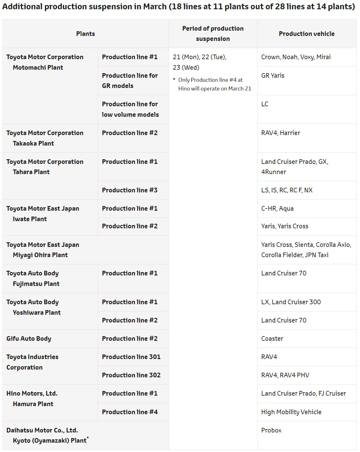 The automaker, though, cites parts shortages resulting from suppliers affected by the earthquakes as the reason for the shutdown, not damage to its plants. As a result, the work stoppages will be limited to just three days at most locations, running from Monday, March 21 to Wednesday, March 23.