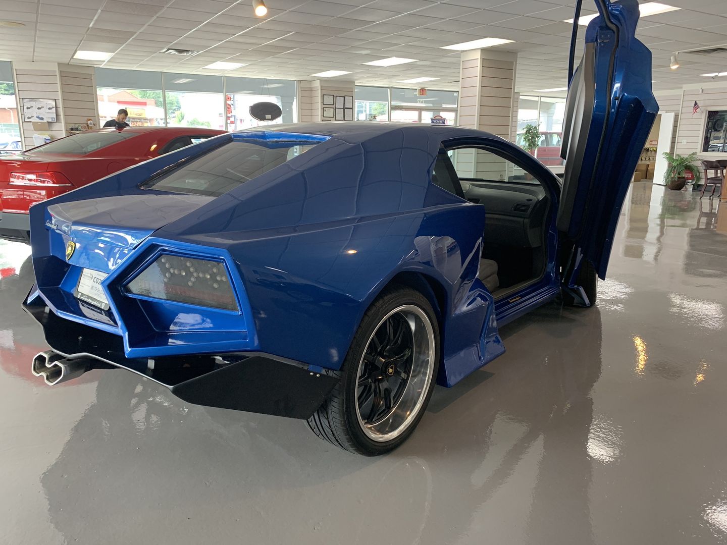 Elsewhere, the car sits on a set of aftermarket wheels with black spokes and chrome-finished barrels, distinctive rear quarter panels, scissor doors, a new rear window, and a customized rear fascia that also looks to the Reventon for inspiration.