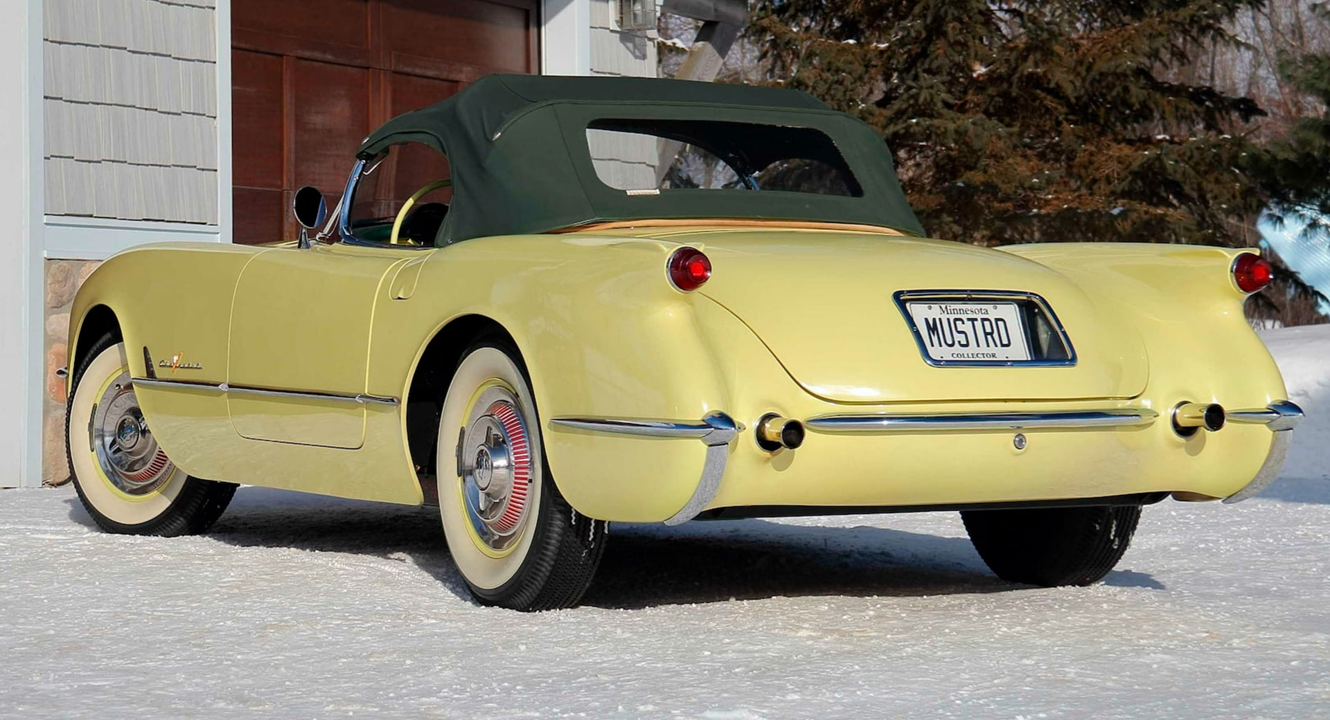 Immediately catching the eye with this Corvette Convertible is the Harvest Gold paint scheme. Just 120 Corvette models built in 1955 are said to have featured this unique shade of washed-out yellow and while we wouldn’t actually consider it to be gold, it is just as eye-catching as the precious metal. Complementing the paint are white-walled tires with Harvest Gold accents and fittingly, the car is currently rocking Minnesota plates that read ‘Mustrd.’