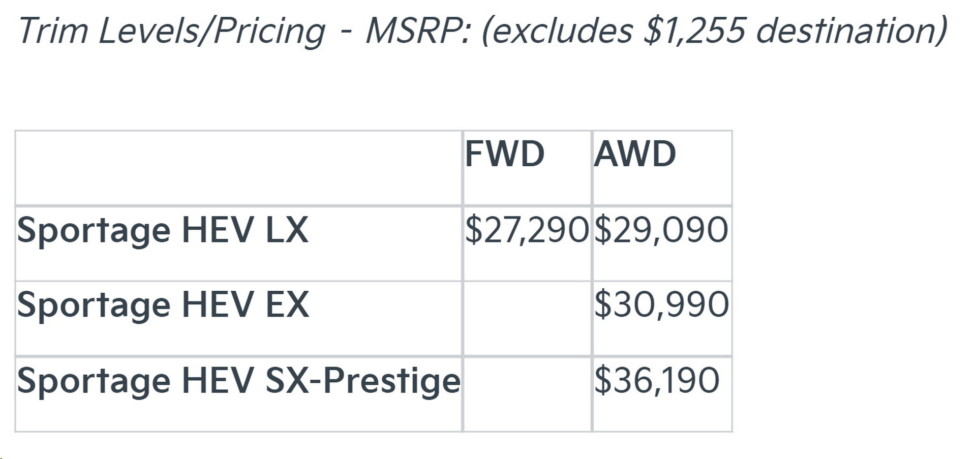 The Sportage Hybrid is available in three trim levels, LX, EX, and SX-Prestige. All will be offered with an AWD drivetrain but only the LX offers FWD.
