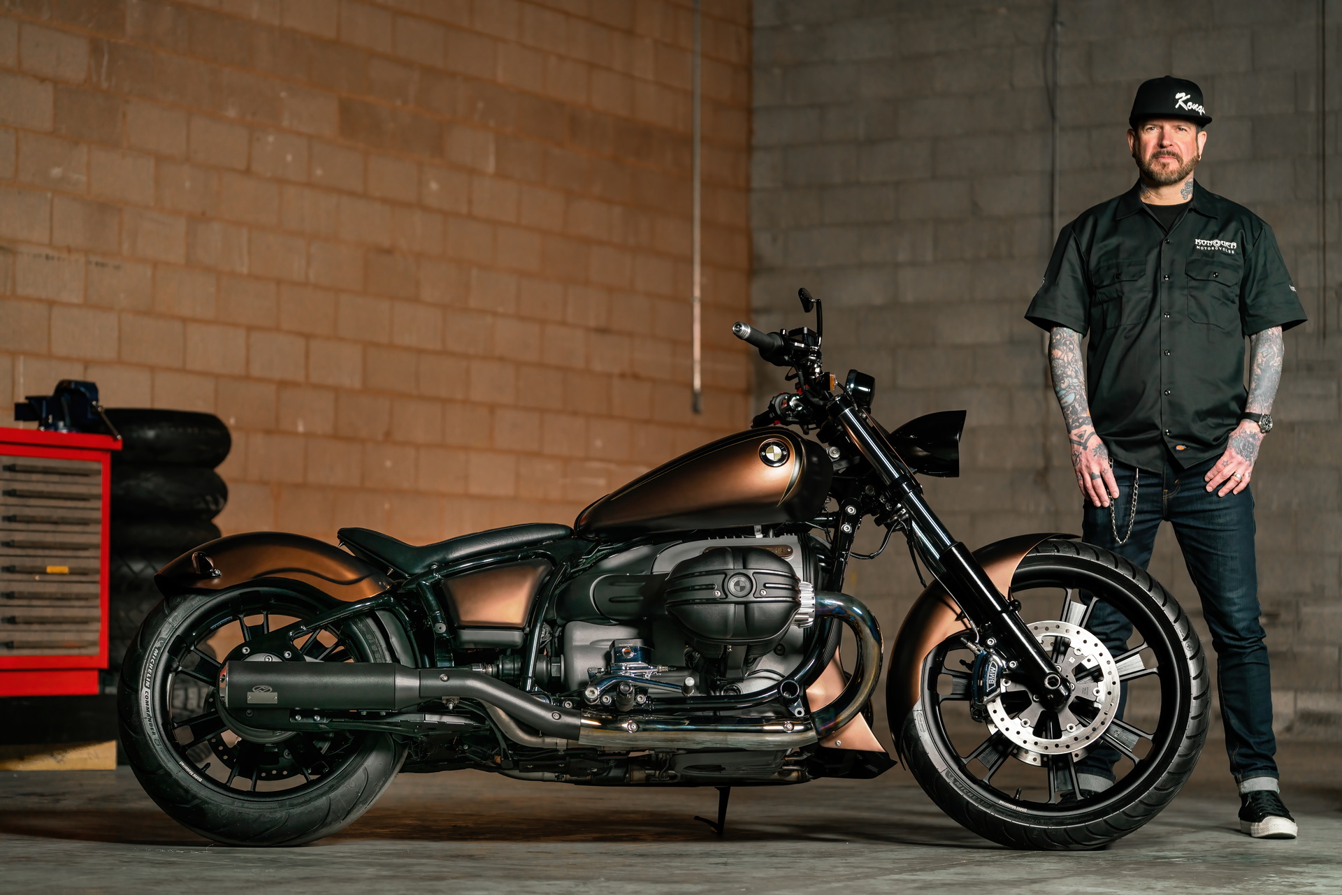 Konquer Motorcycle, finally, made the R 18 Diamond Custom, whose design was led by Rob Thiessen. The bike is described as a factory custom dragster that combines bronze metallic paintwork and pinstriping with modified front and rear fenders. The custom seat features a diamond motif and the whole look is intended to be long and low. Gold-painted BMW roundels and an electronically adjustable exhaust top the whole look off.