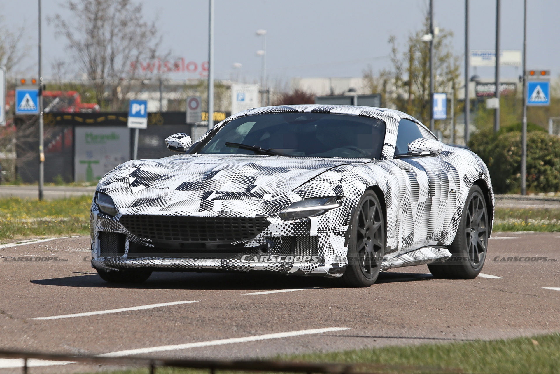Although the camouflaged car looks quite a bit like the Ferrari Roma, it’s also evident that the proportions have been stretched and flattened slightly and the wheels enlarged (suggesting they hide bigger brakes), likely to deal with the extra power of a bigger engine. All of which leads observers to infer that it will be powered by a V12 engine, something that’s also evidenced in a video of the test mule caught by YouTuber Varryx.