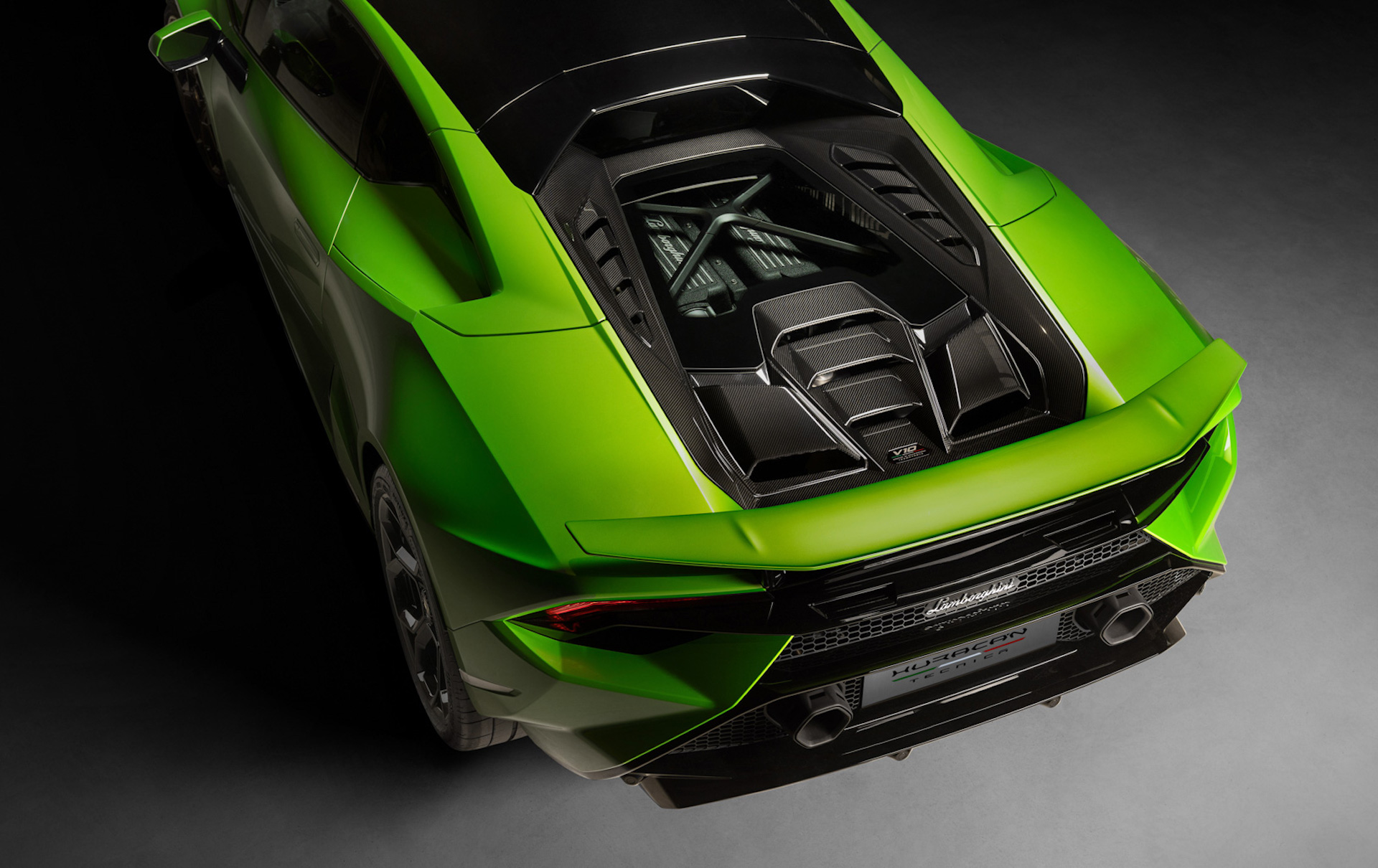 Weight is also down versus the entry-level car in part thanks to that carbon hood, but when the press release brags that black bodywork at the base of the windshield “increases the lightweight impression” you know to temper your expectations. Lamborghini quotes a dry weight of 3,040 lbs (1,379 kg) for the Tecnica, versus 3,062 lbs (1,389 kg) for the Evo RWD, and 2,952 lbs (1,339 kg) for the no-compromise STO.