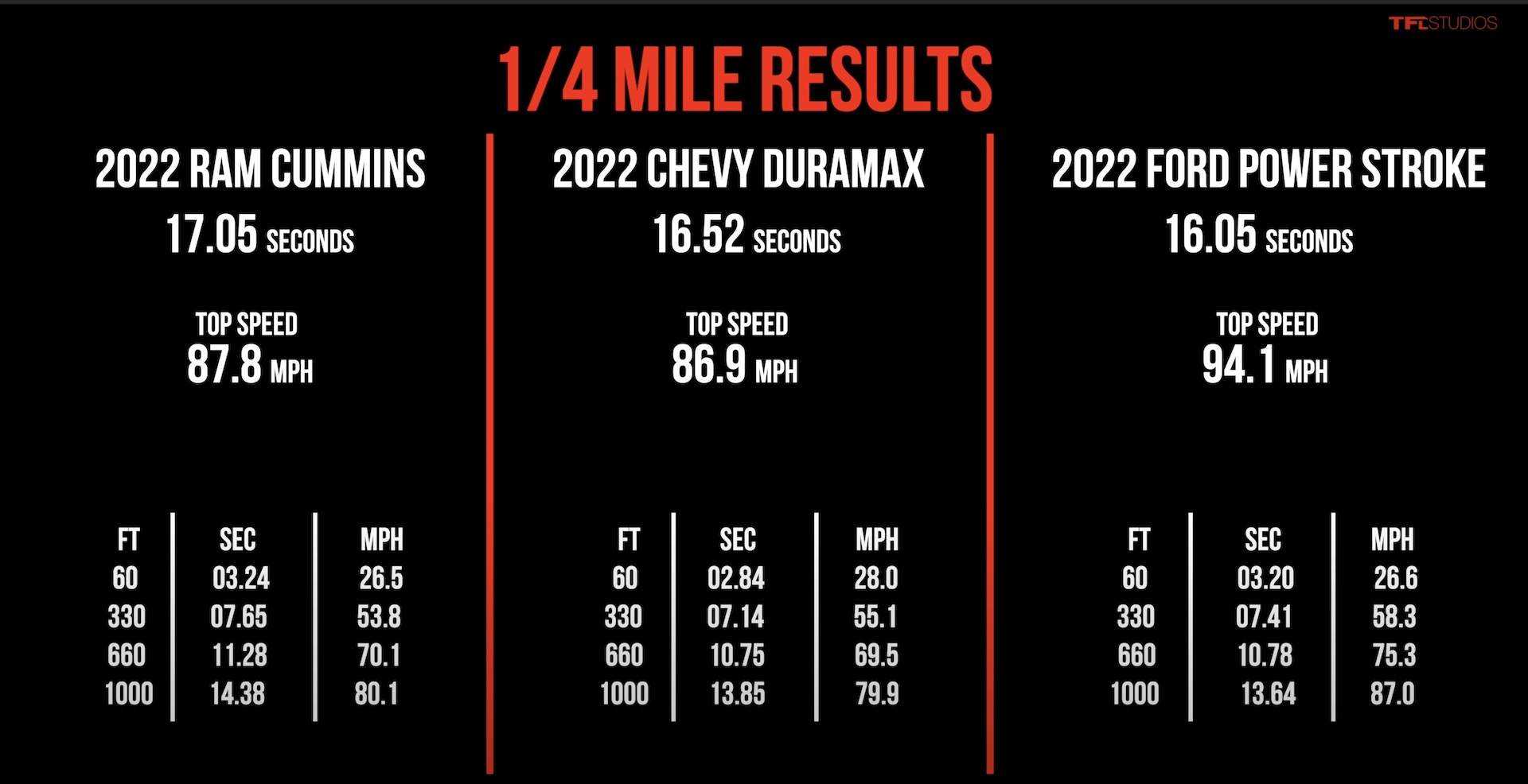 That’s exactly what Colorado-based YouTube channel The Fast Lane Truck did. The TFL team got hold of a 2022 Ford F-250 Power Stroke, a 2022 Chevrolet Silverado 2500 Duramax and a 2022 Ram 2500 HD and sent the three trucks down a quarter mile of an air strip to see which reached the end first, and which was left to, well, pick up the pieces.