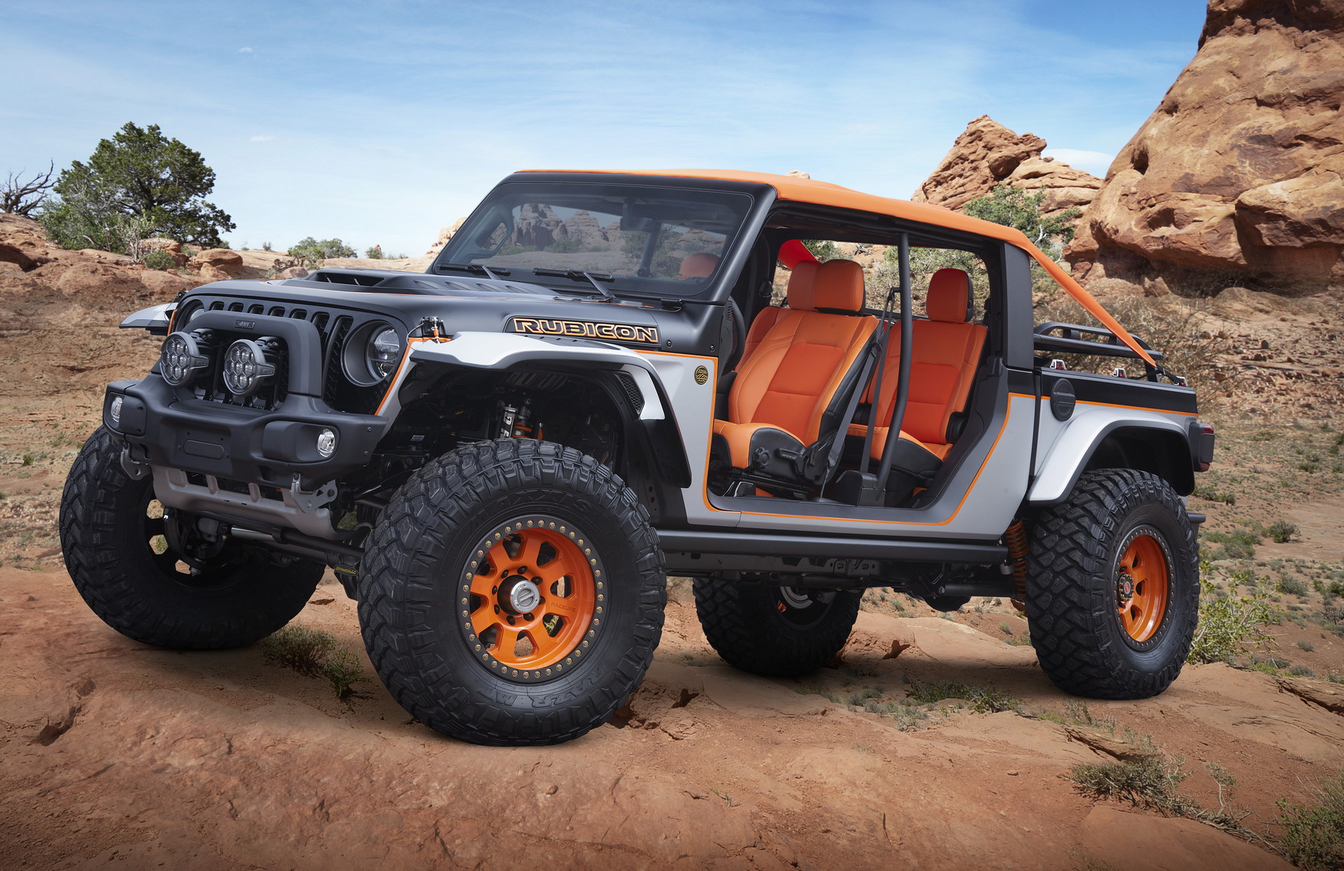 The Jeep Bob is a chopped-up Gladiator that looks more like a Wrangler with a small rear bed. The cool name refers to the term “bobbing” which means shortening the rear overhang for better off-road credentials. The fenders are also cut in order to accommodate the 20-inch wheels shod in massive 40-inch tires. Other exterior mods include the orange canvas roof, the metal rack on the rear bed, and the extra LEDs on the bespoke bumper. The concept is fitted with a 3.0-liter V6 diesel engine, while the Dynatrac Pro-Rock 60 axles and the bespoke suspension with a 3-inch lift kit, King Coils and Bypass shocks, should make it unstoppable off the beaten track.