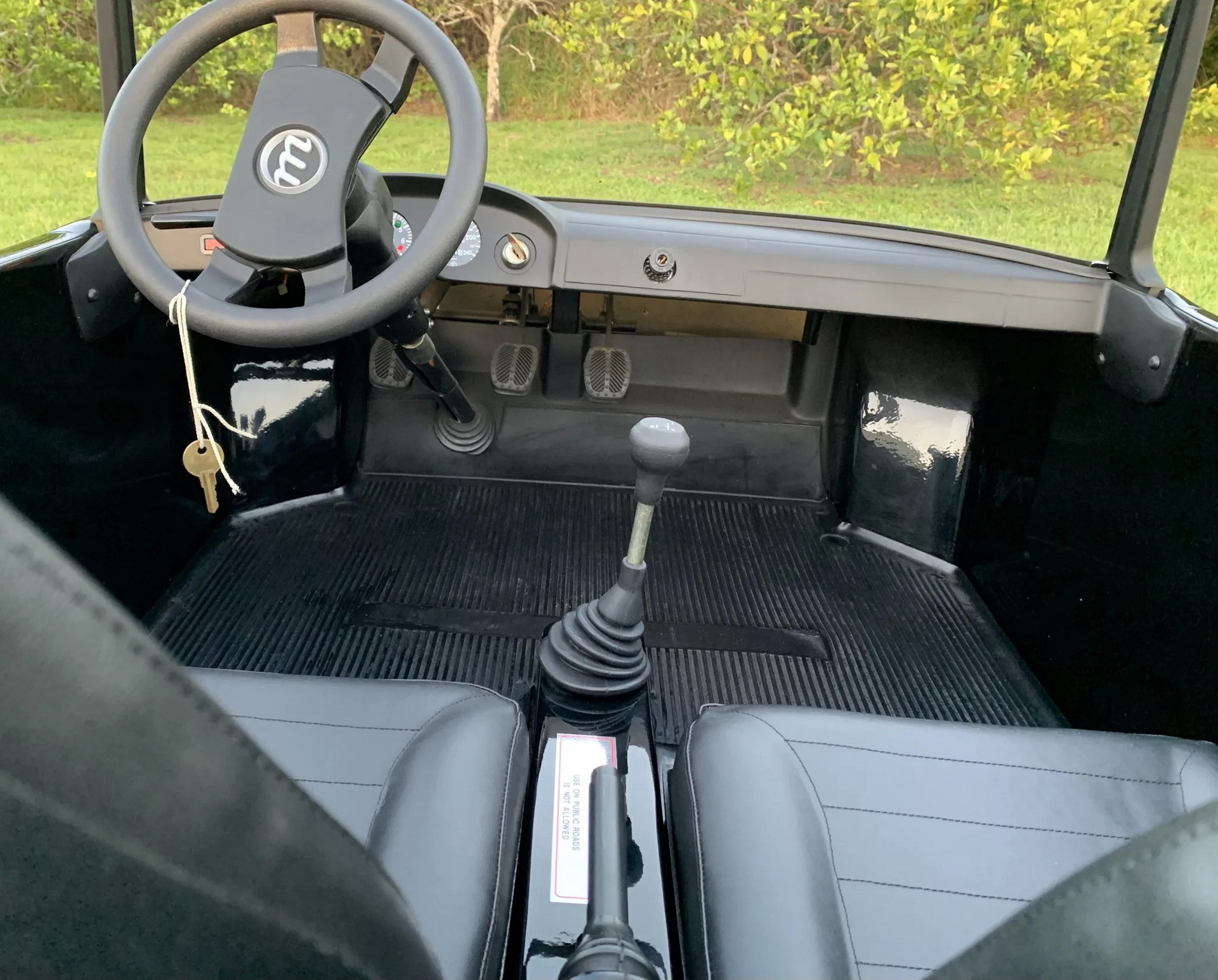 Although it’s essentially a go-kart, it’s a rather sophisticated one because it has coil springs at all four corners, a 12-volt electrical system, a hinged trunk, and a four-spoke steering wheel. It also has steel Gullideckel-style wheels that are wrapped with 13×5.00–6 Duro bias-ply tires.