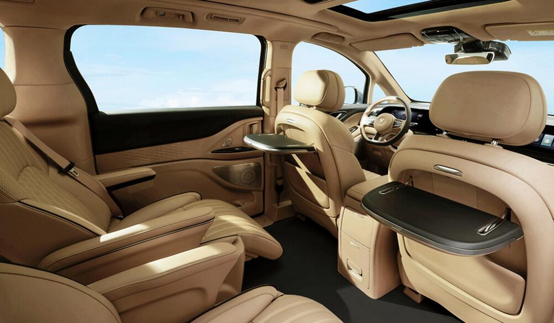 Inside, the minivan comes in four- or seven-seater configurations. The latter has a 2+2+3 layout which means that the front two rows enjoy captain’s chairs while cargo space is still pretty adequate at 427 lt (15 cubic feet). Equipment is generous with three screens on the dashboard, heated and ventilated seats with massaging function, reclining footrests, vegan leather upholstery, electric sliding doors, a DYN Audio sound system, Level 2+ autonomous driving capability, 5G connectivity, and adaptive air suspension.