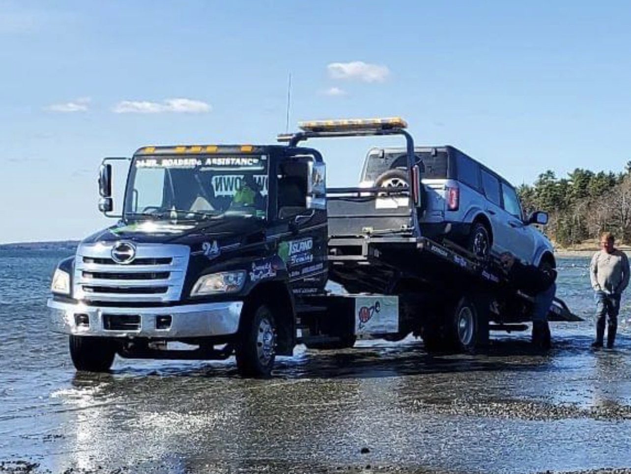 Lee Foss of Island Towing has towed so many vehicles off of the beach that his company has a specific Ram truck to deal with such incapacitated vehicles. When he got the call last Saturday night around 5 pm he wasn’t told how far out this latest vehicle actually was. Two days later with the help of a flatbed and two boats, he finally got his Bronco.