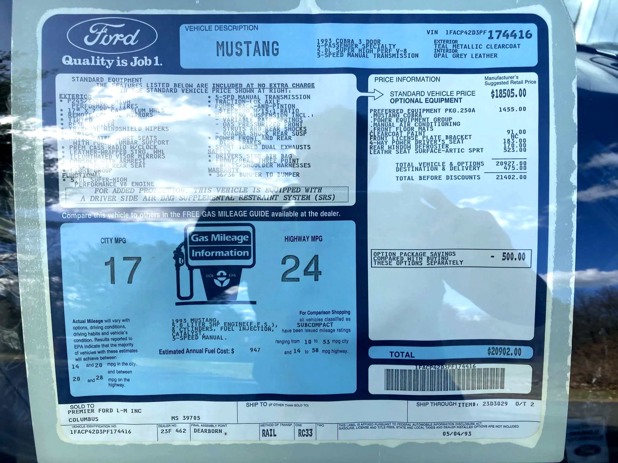 The pristine car pictured here has certainly never been subjected to drag strip abuse. In its 29 years it has only covered 35 miles (56 km), the equivalent of 5 quarter mile runs per year. Finished in bright Teal Blue, one of four colors available, it still has its window sticker affixed to the passenger door glass and the full complement of protective interior wrappers. Ford’s other SVT Mustang for 1993, the Cobra R, was a hardcore track-ready machine with a stripped down interior, but the street-biased Cobra retained its power accessories.