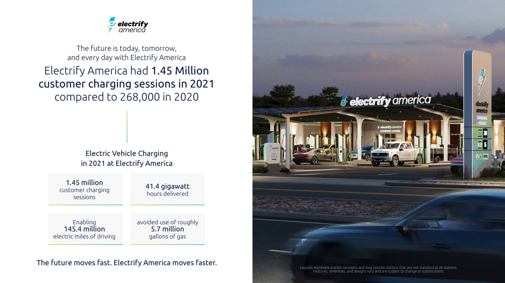 Electrify America announced this week that it provided 1.45 million charging sessions to owners of fully-electric vehicles in 2021. In 2020, by contract, it provided just 268,000 EV charging sessions.