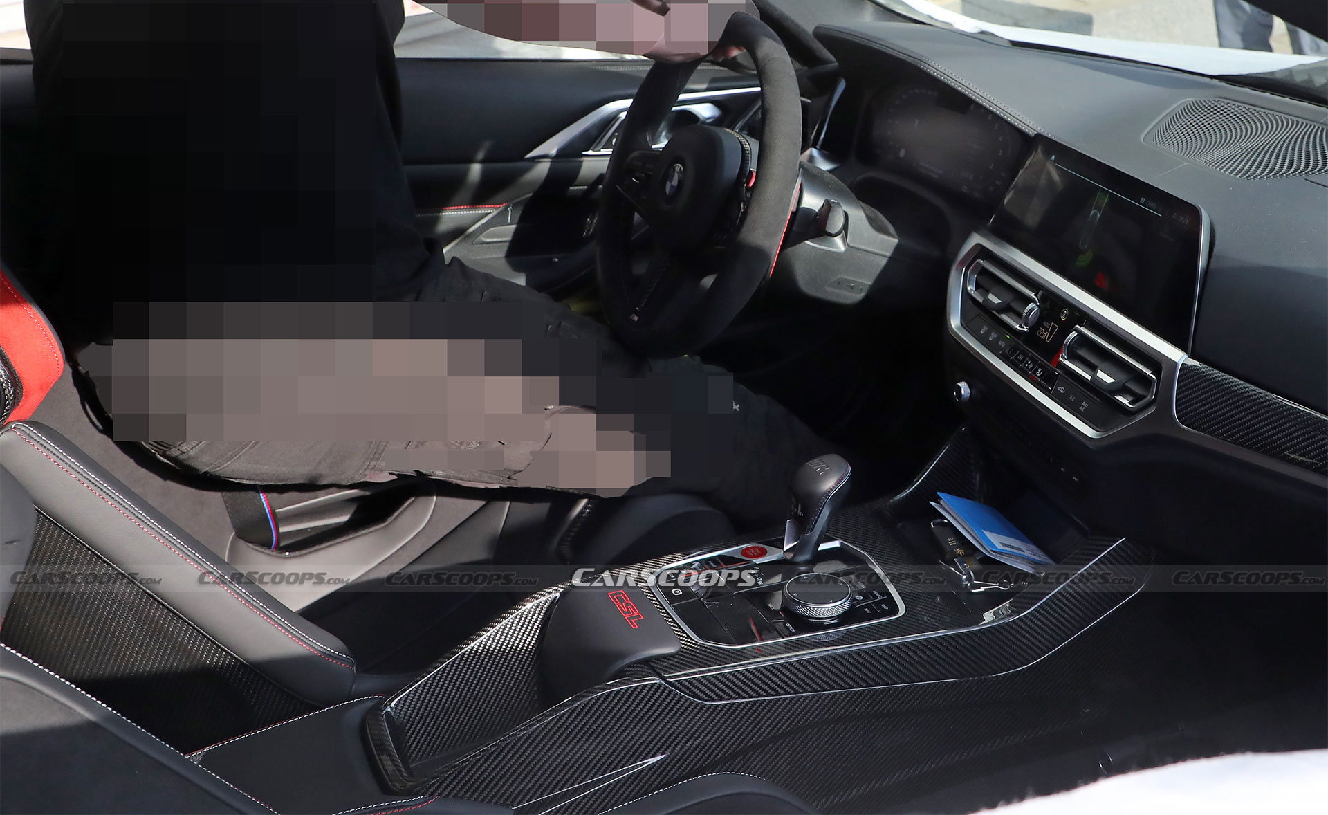 We were also able to snap a few photos of the prototype’s interior. Seats similar to those of the BMW M5 CS are visible and wrapped in a combination of black and red leather while made from lightweight carbon fiber. BMW has also removed the coupe’s rear seats and bathed the transmission tunnel in carbon fiber, deleting at the same time the center armrest. There is also a red-stitched CSL logo near the gear shifter, a red engine Start/Stop button, and an Alcantara-wrapped steering wheel with red contrast stitching.