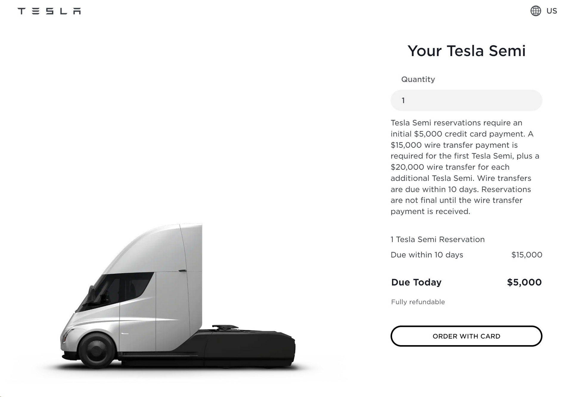 Tesla recently updated its reservation page for the all-electric tractor-trailer it first announced in 2017. Prospective customers are now invited to put down a $20,000 deposit for the Semi.