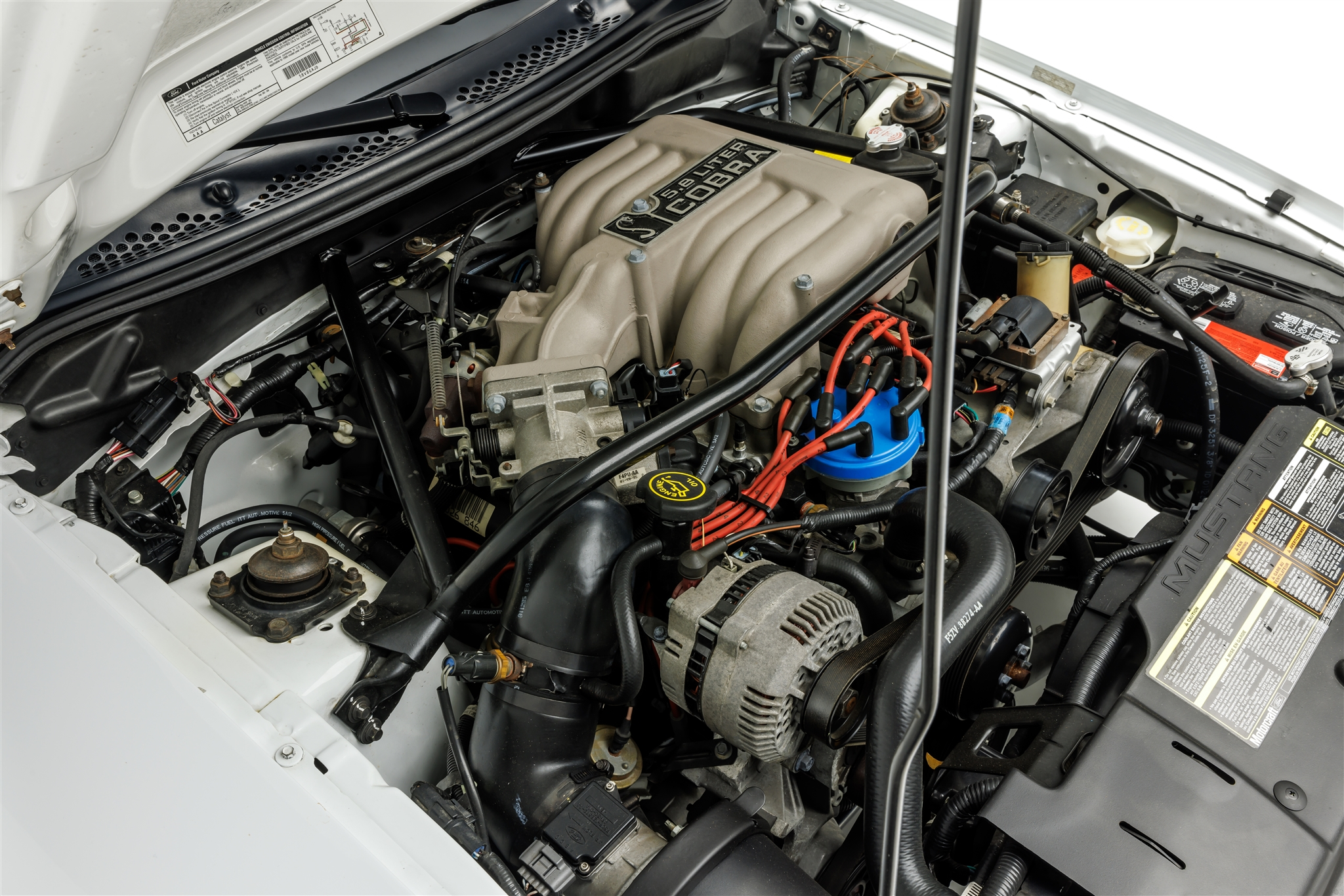 The Mustang features a fiberglass hood with a larger cowl to make room for the larger intake manifold, which is sitting atop a 5.8-liter Windsor V8 borrowed from the SVT Lightning pickup. The engine was warmed over with higher compression pistons, an aggressive camshaft, and a larger throttle body, which pushed the horsepower up to 300, with 265 lb-ft of torque.