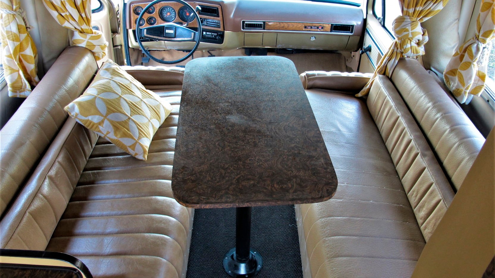 Moving into the cabin, we can see a classic two-spoke steering wheel, wood trim, and tan front seats. Of course, the camper is the real highlight and an old brochure reveals the model came equipped with “convertible bunk seats” and a standard dinette table.
