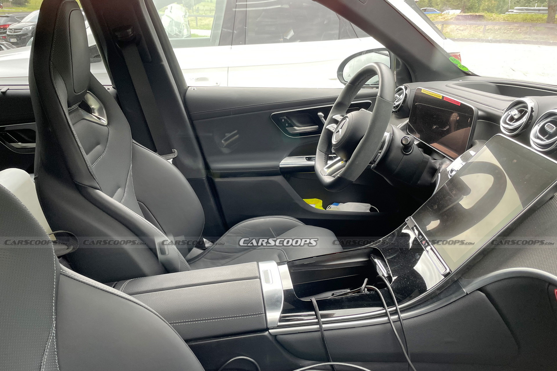 This time we also got a glimpse of the interior, which predictably looks almost identical to the lesser GLC models. We can see the 12.3-inch free-standing digital instrument cluster, the heavily inclined 11.9-inch central touchscreen on the center console, and the color heads-up display. The AMG gets a sportier set of bucket seats, and new suede-style upholstery for the flat-bottom steering wheel while we should expect sporty accents like metal and carbon fiber bits.