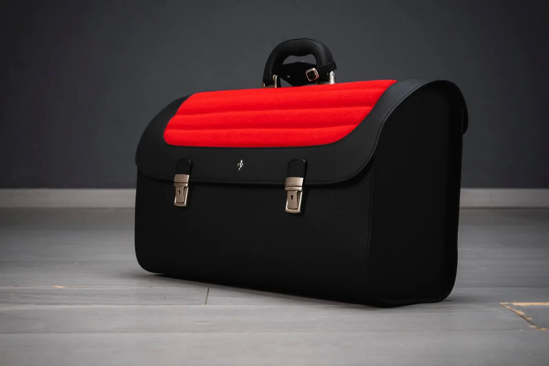 Produced by Schedoni specifically to fit the Ferrari F50, the set is made up of a handbag, a garment bag, and a duffel bag. Made of black leather with black stitching and featuring contrasting segments in red suede, the set could now be yours.